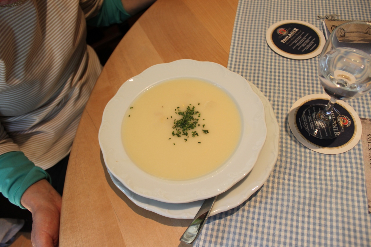私はアスパラのスープ、夫はソーセージの盛り合わせを注文。料金はソーセージの盛り合わせが13.9ユーロ、スープは5.8ユーロ。ビール、ワイン、ミネラルウォーターを加えて計32.2ユーロ+チップ3ユーロ。味も良く、店の雰囲気もインテリアも好もしかったので満足した。