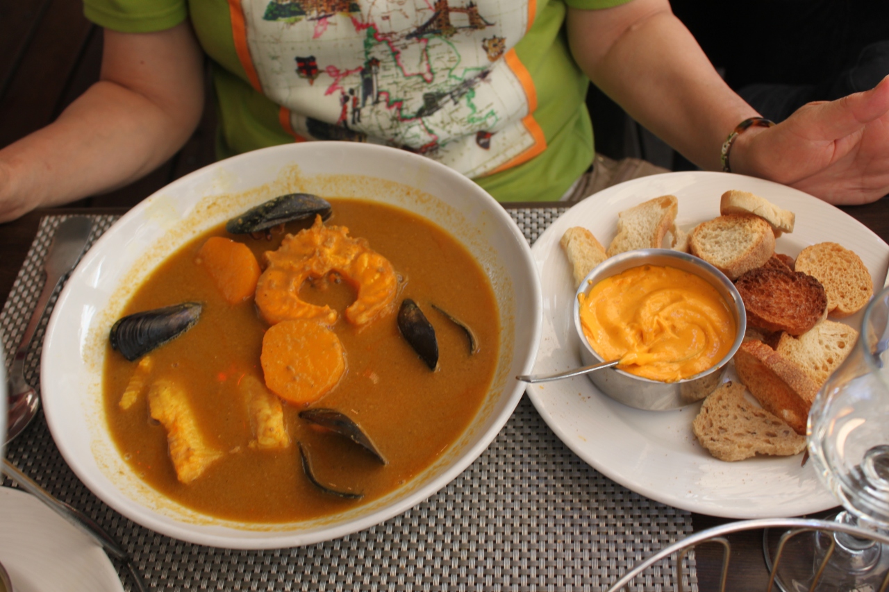 夫は生のシーフードミックス(カキ、エビ、ムール貝、ツブ貝、アサリ)の盛り合わせ。これは大きな器に氷をどっさり入れて見た目も豪華。量もたっぷり。私はイカとサーモンのマリネとブイヤーベース。マルセイユで是非食べようと思っていたので満足。濃厚で良い味。夫もワインも進んで良い店だと上機嫌だった。しめて46.7ユーロ。