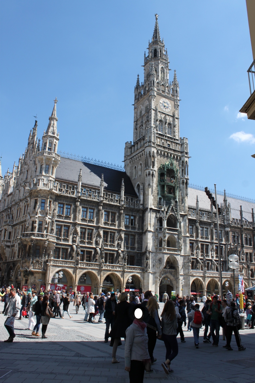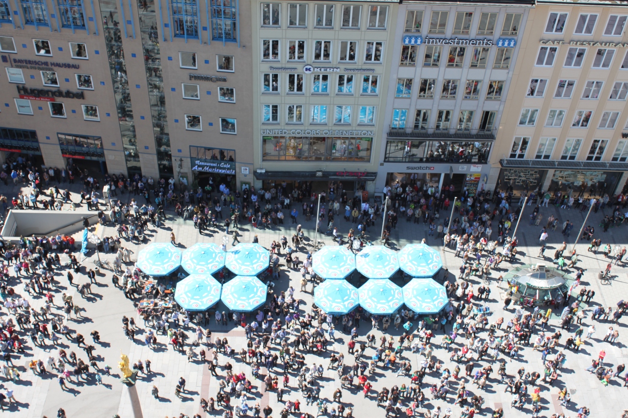 旧市街の中心的存在。ミュンヘン観光の一番のポイントの場所でしょう。ここに建つ市庁舎のからくり時計を見るために多くの人が集まって、夜ともなればとても賑やか。私たちは昼間は市庁舎の上からこの広場を上から眺めた。お店のテラス席の大きなパラソルがたくさん並んで壮観。