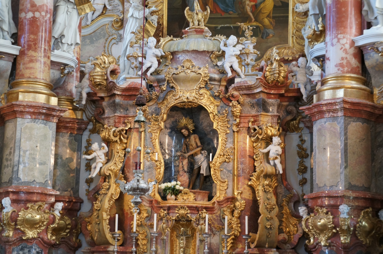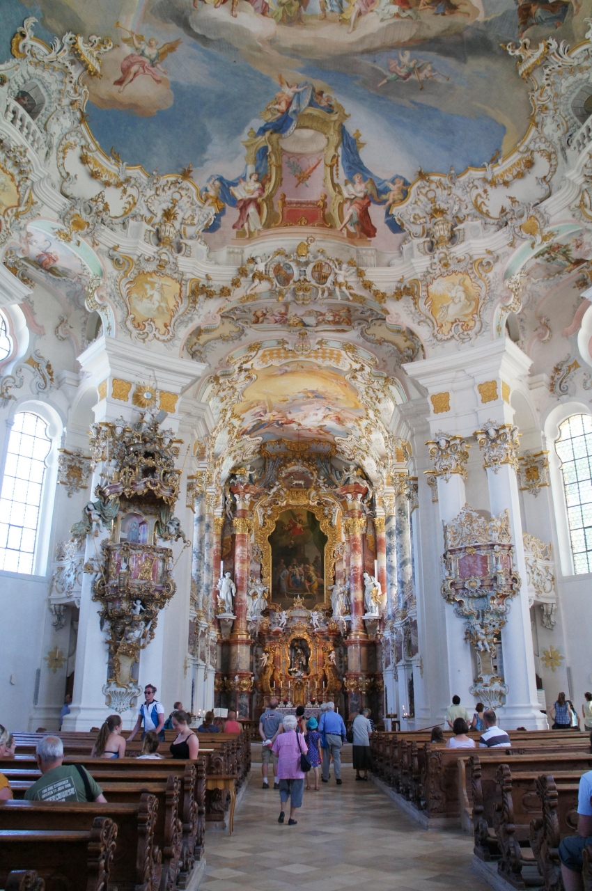 のどかな田園風景の中にポツンとある世界遺産の教会です。フュッセンから確か78番のバスでホーエンシュヴァンガウ経由で40分前後かかります。本数は少なく一日4~5便なので、バスで行く場合は必ずDBのサイトで往復の運航スケジュールを調べてから。外観はこれが世界遺産?と思うほど素朴な田舎の教会なのですが、一歩中に入ると・・・色彩鮮やかなロココ調の素晴らしい装飾に目を奪われます。祭壇に安置されている「鞭打たれるキリスト像」は小さく、周りの華麗な装飾の中に埋もれているといった感じですが、信者の方々にとってはまさに奇跡なのでしょう。訪れる価値のある教会だと思います。写真撮影はフラッシュなしだと許されるようです。