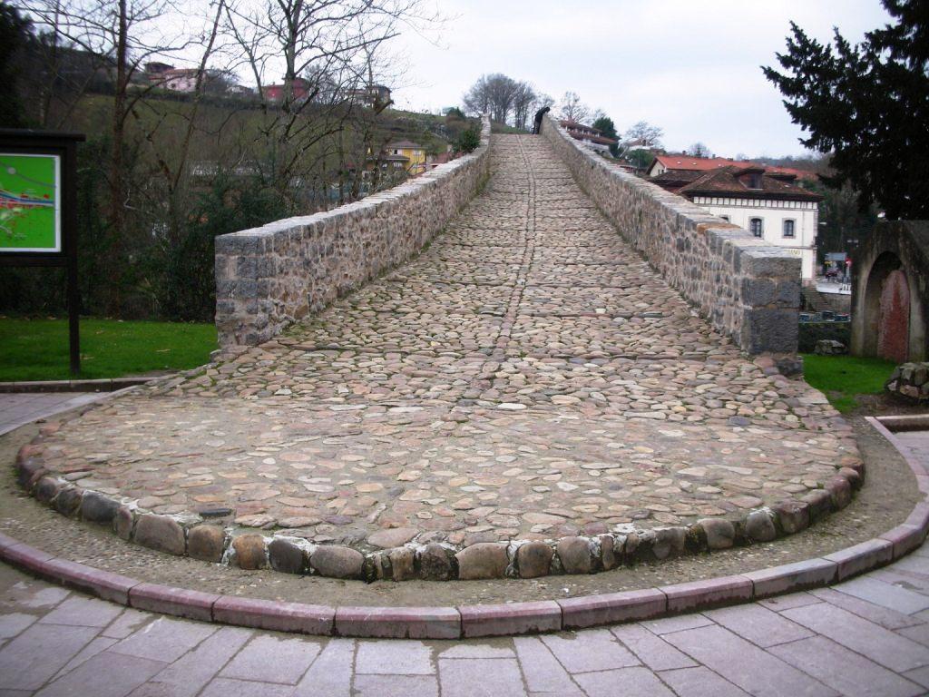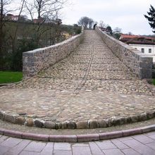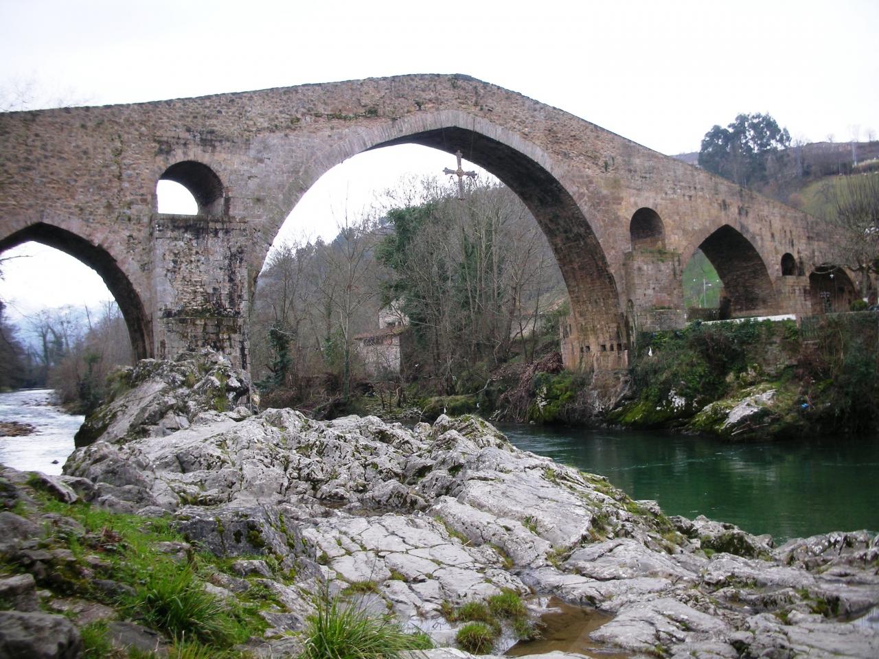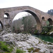 町のシンボルとも言える、セリャ川に架かるローマ橋(Puente Romano)。現在のものはカスティーリャ王アルフォンソ11世の時代に掛けられたそうです。橋の真ん中には、勝利の十字架(Cruz de la Victoria)の複製が吊り下げられており、この橋と十字架はカンガス・デ・オニスの町の紋章や旗に用いられています。