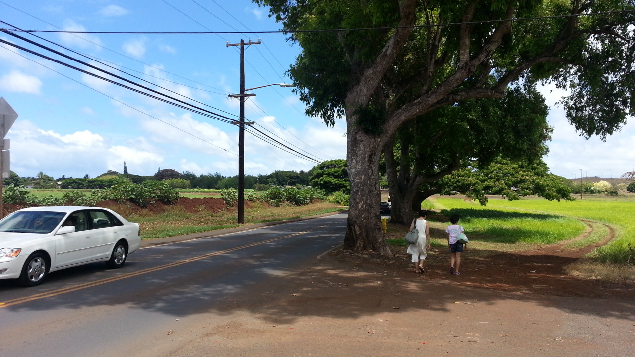 何より、狭い一本道(カメハメハハイウェイ)を結構な交通量で車が通り、歩道もあまり整備されていないので、のんびり歩く雰囲気ではないのですね。