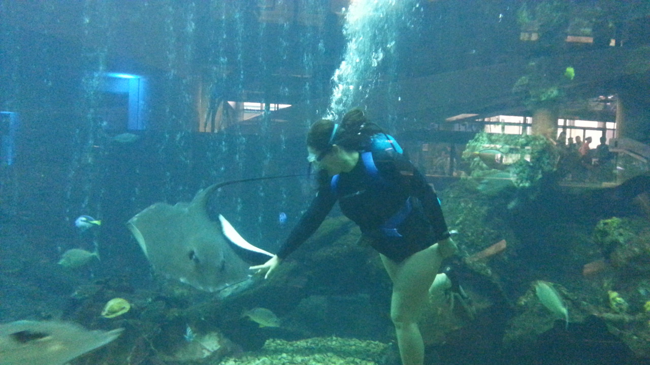 17時、19時、21時に、水槽にダイバーが入って餌やりをします。水槽側の各テーブルの前で、ダイバーがエイと戯れる様子は、見応えありです。