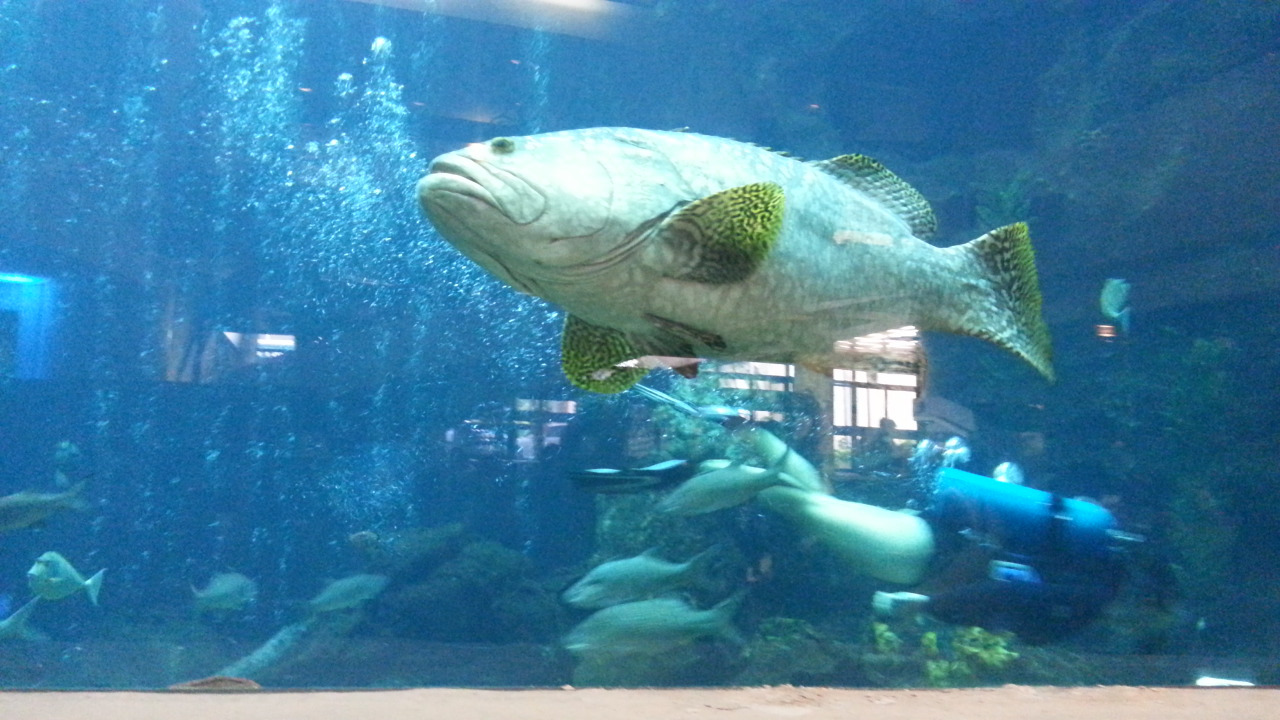 前回行ったときは予約なしで、水槽から離れた席だったのですが、今回は日本から予約して、窓側の席でした。おかげで海のような水槽の様子をゆっくり眺めることができ、楽しい食事となりました。