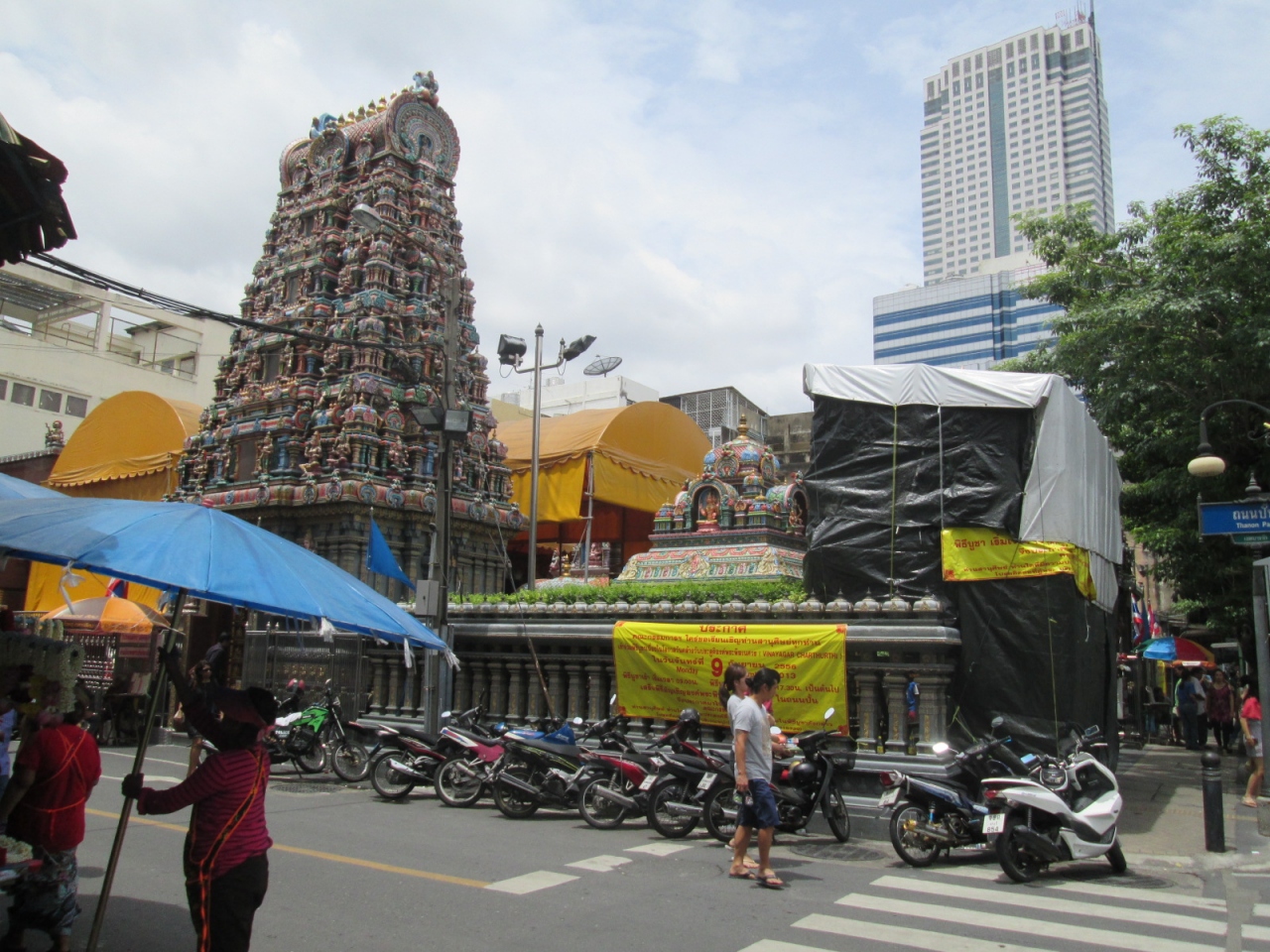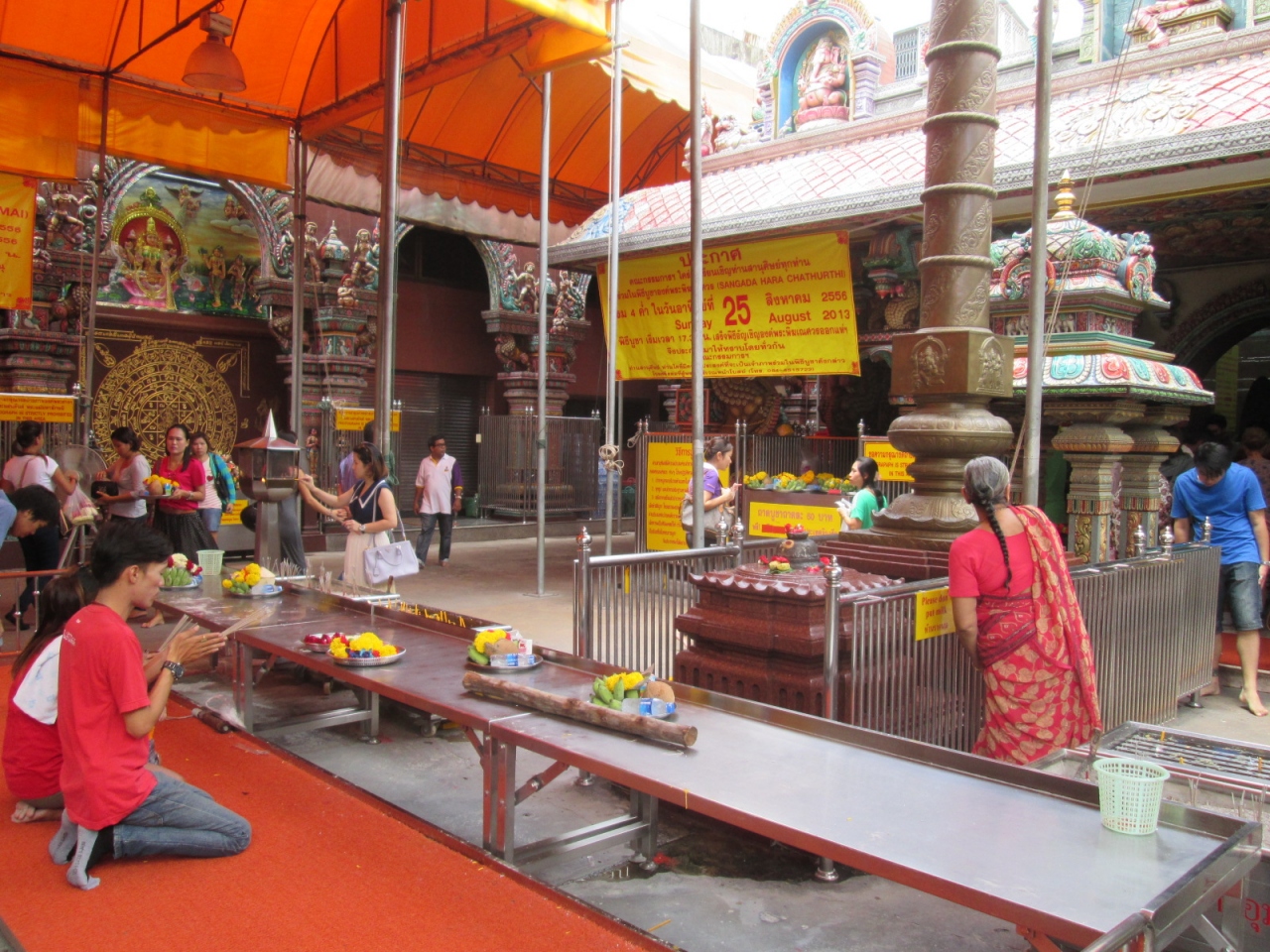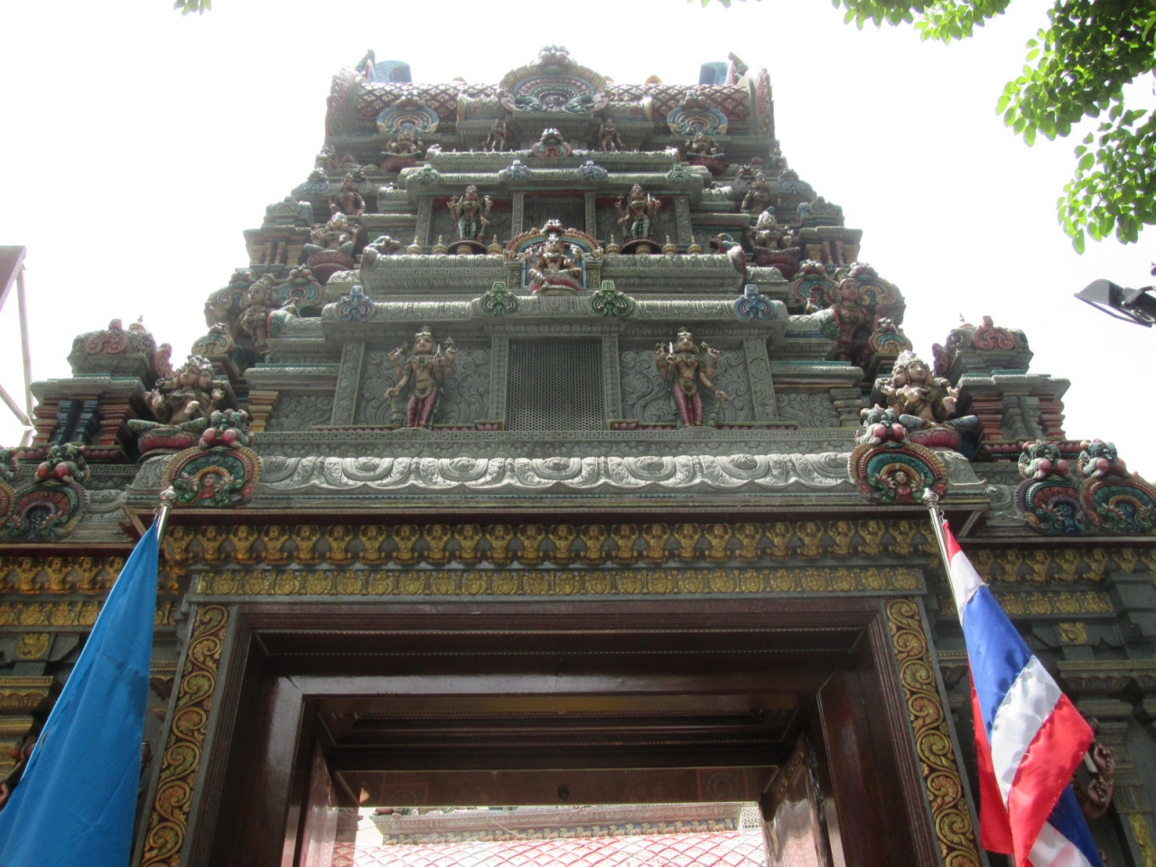 タクシーでシーロム通りを走っていると、必ず目に入る派手な装飾。ずっと前から気にはなっていたのですが、訪問したのは今回が初めてです。大規模修復中なのでしょう、多くの場所がシートで覆われていて残念でしたが、仕方ありません。シーロム通り沿いの門から入ると、何か特別な日だったのか、あるいは常にそうなのか分かりませんが、境内は信者の人たちで一杯でした。見るもの、感じるもの、何もかも初めてのものばかり。ふと見ると、境内で靴を履いているのは私だけ。もちろん、直ぐに脱ぎました。本当は本堂に入って御本尊様を見たかったのですが、信者の人であふれている本堂に入る勇気はなく、遠目から写真を撮っただけで退散しました。御本尊様には次の機会にお目にかかりたいと思います。