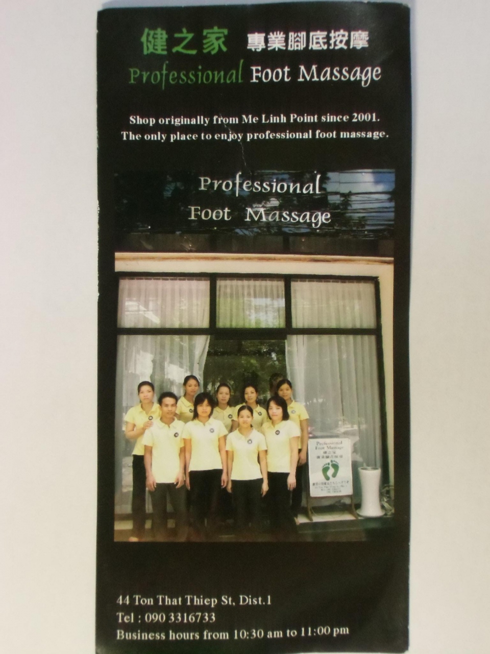 アイスクリーム店ファニーの斜め前にあるフットマッサージ専門店です。1階と2階2室で合計30席と大規模店です。70分でチップ込み22万ドン(約1050円)で、帰りに受付で払います。マッサージ師も約80名ほどおり、大部分は女性です。席に案内する女性に、マッサージ師が女性か男性かのリクエストをすることもできます。膝上10cmぐらいまでマッサージがありますので、スカートや長ズボンの場合、短いズボンを無料で貸してくれます。ただし着替えはトイレですが。70分のうち最初の約50分がフットマッサージ、その後、腕と手のマッサージ。最後に向きを変えて頭と背中のマッサージです。日本語は通じませんが、「痛い」「気持ちいい」などの必要最小限な単語は日本語で通じますので、もし痛ければ我慢せずに日本語で「痛い」と言えば力を弱めてくれます。店内は静かで、とても雰囲気の良いお店です。ホーチミンに滞在の間、毎日最低1回は通っています。チップは不要ですが、もしマッサージがやサービスがよければ、チップ5万ドン(約240円)を直接そのマッサージ師に渡されても構いません。