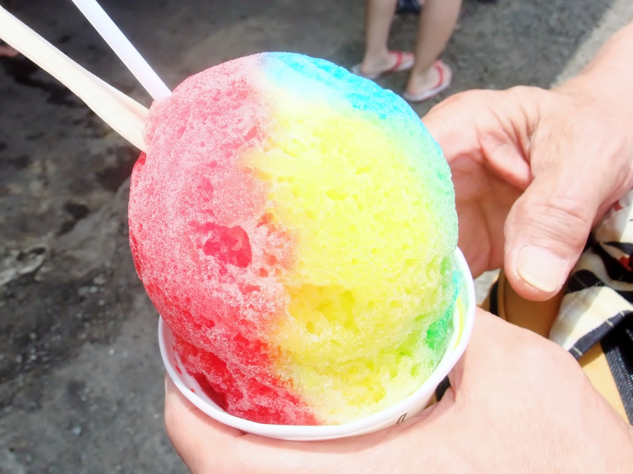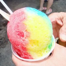 私たちもレインボーシェブアイス(2・5ドル)に舌鼓を打ちました。ストロベリー、パイナップル、レモンフレーバーにバニラアイスが足してあります。