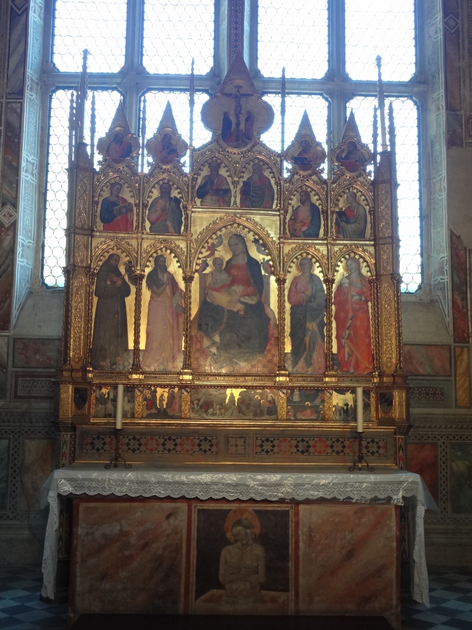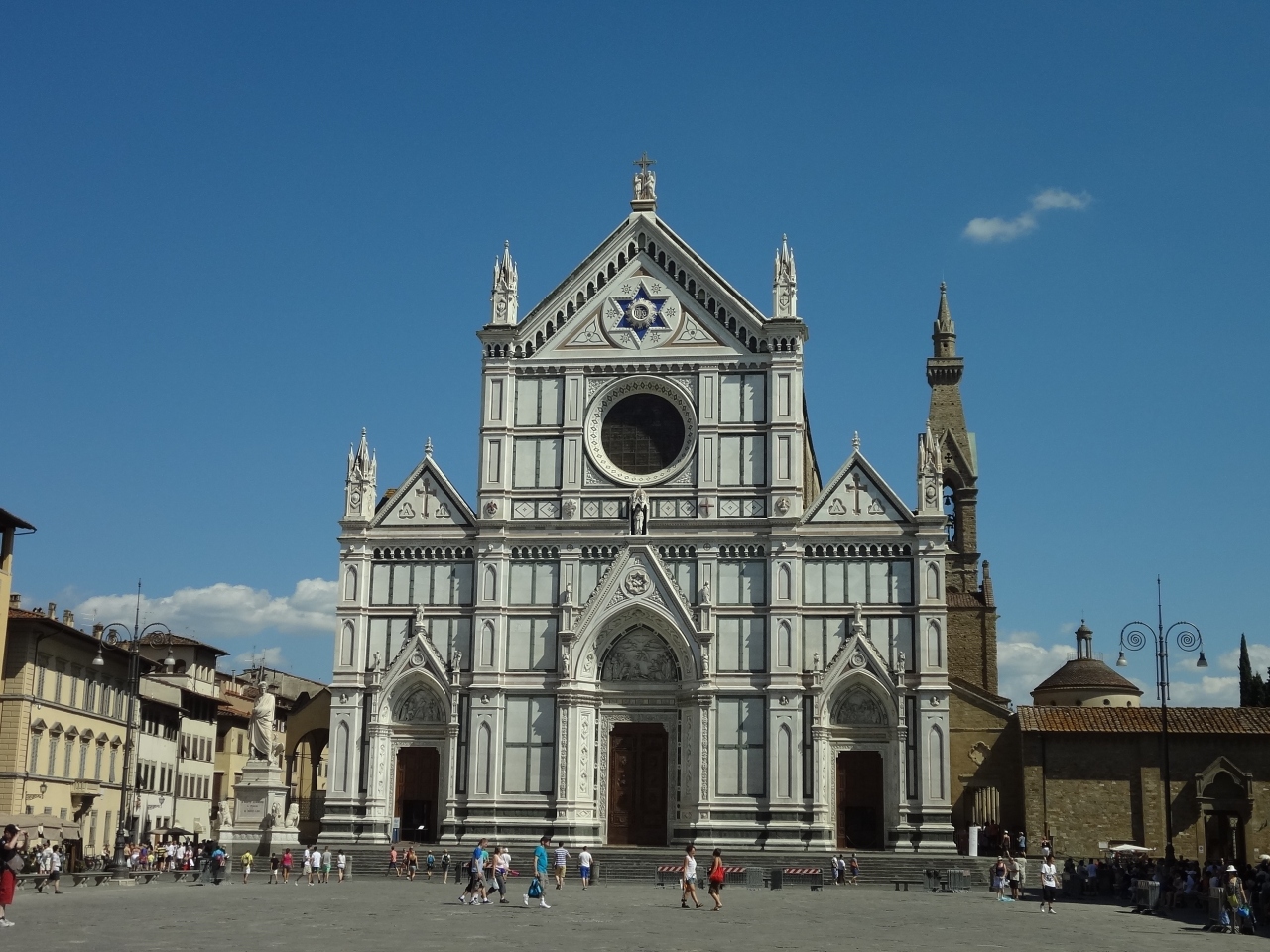 ヴェッキオ宮から路地を東へ、革製品の店を冷やかしながら、広いサンタ・クローチェ広場までやってきました。教会の見学者入口は向かって左側にあり、西洋人中心の短い行列に並び、6ユーロ支払って中へ入りました。ミケランジェロの墓など、多くの有名人の墓にそれぞれ精緻な彫刻がありました。床にあった大理石のレリーフ(棺?)が、長年踏まれたためか、かなりすり減っていたのは少々残念ですが、現在はロープで保護されています。特に彫刻に興味のある方には良いと思います。
