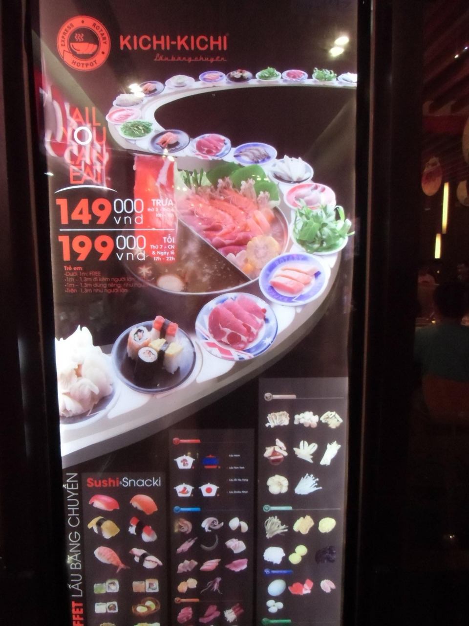日本でクルクル回ると言えばお寿司ですが、ベトナムでは回る鍋の食べ放題があります。昼食時間149000ドン(約710円)、夕食時間199000ドン(約950円)ですが、飲み物は別料金です。鍋は各自の前にあり、肉やエビや野菜などの食材が回っていますので、それを取って自分の鍋に入れて食べます。