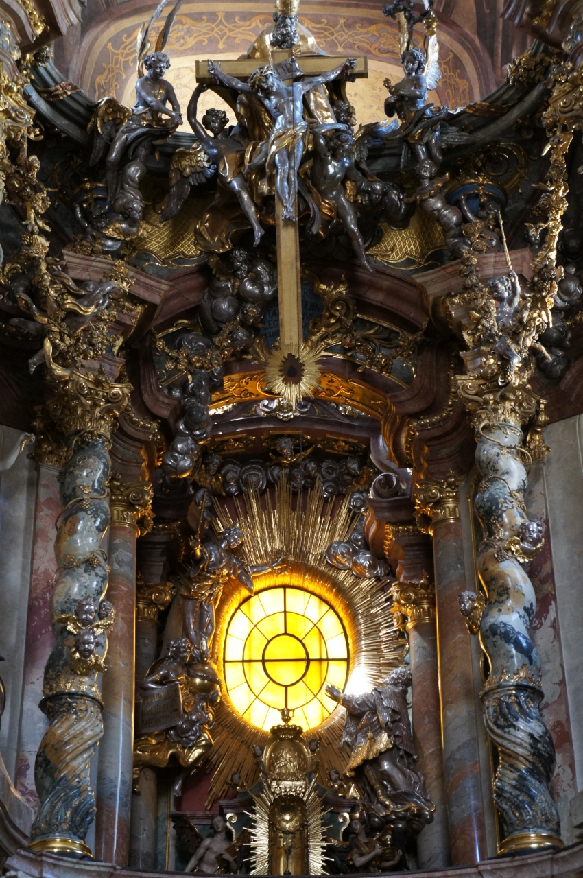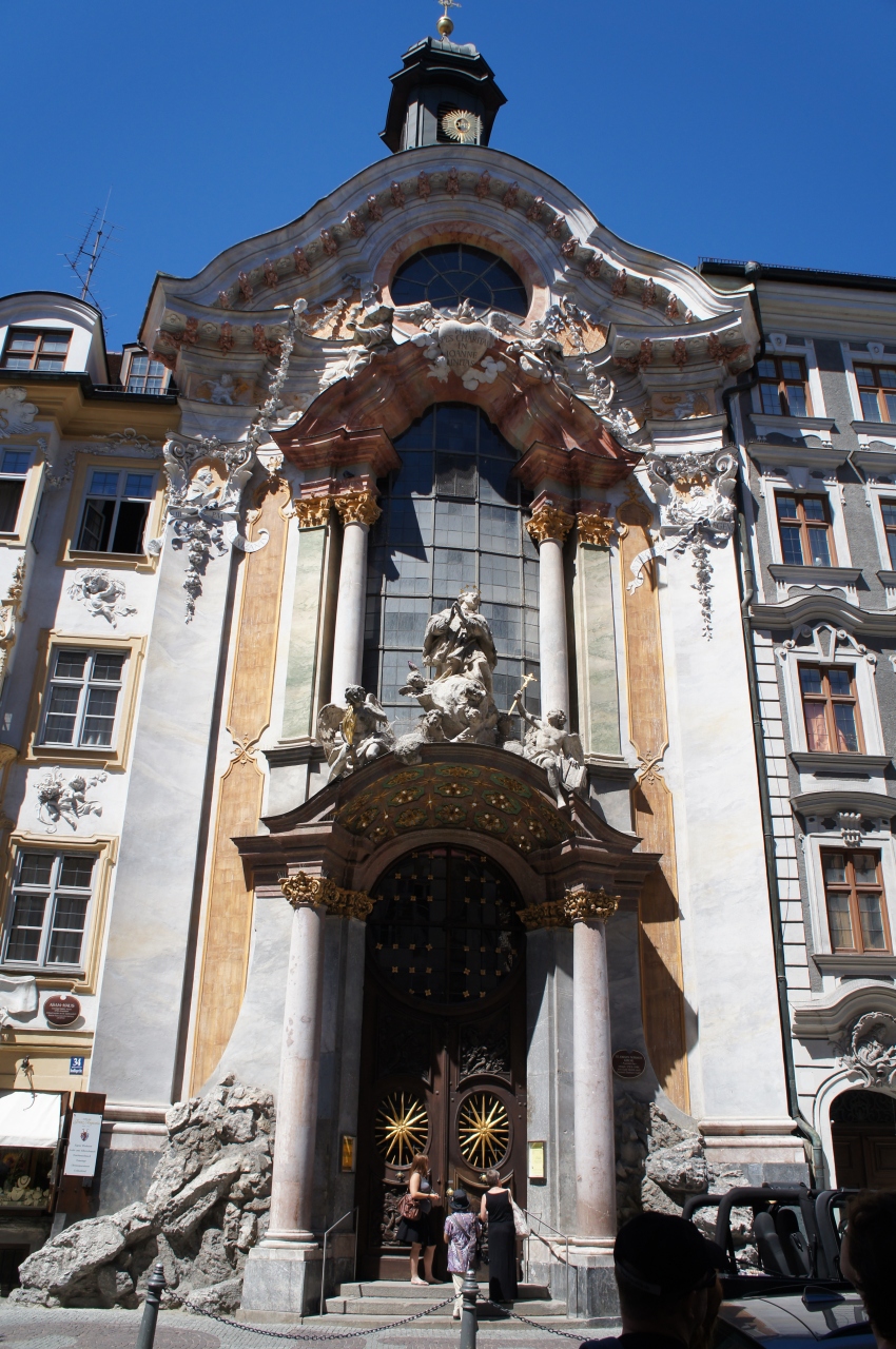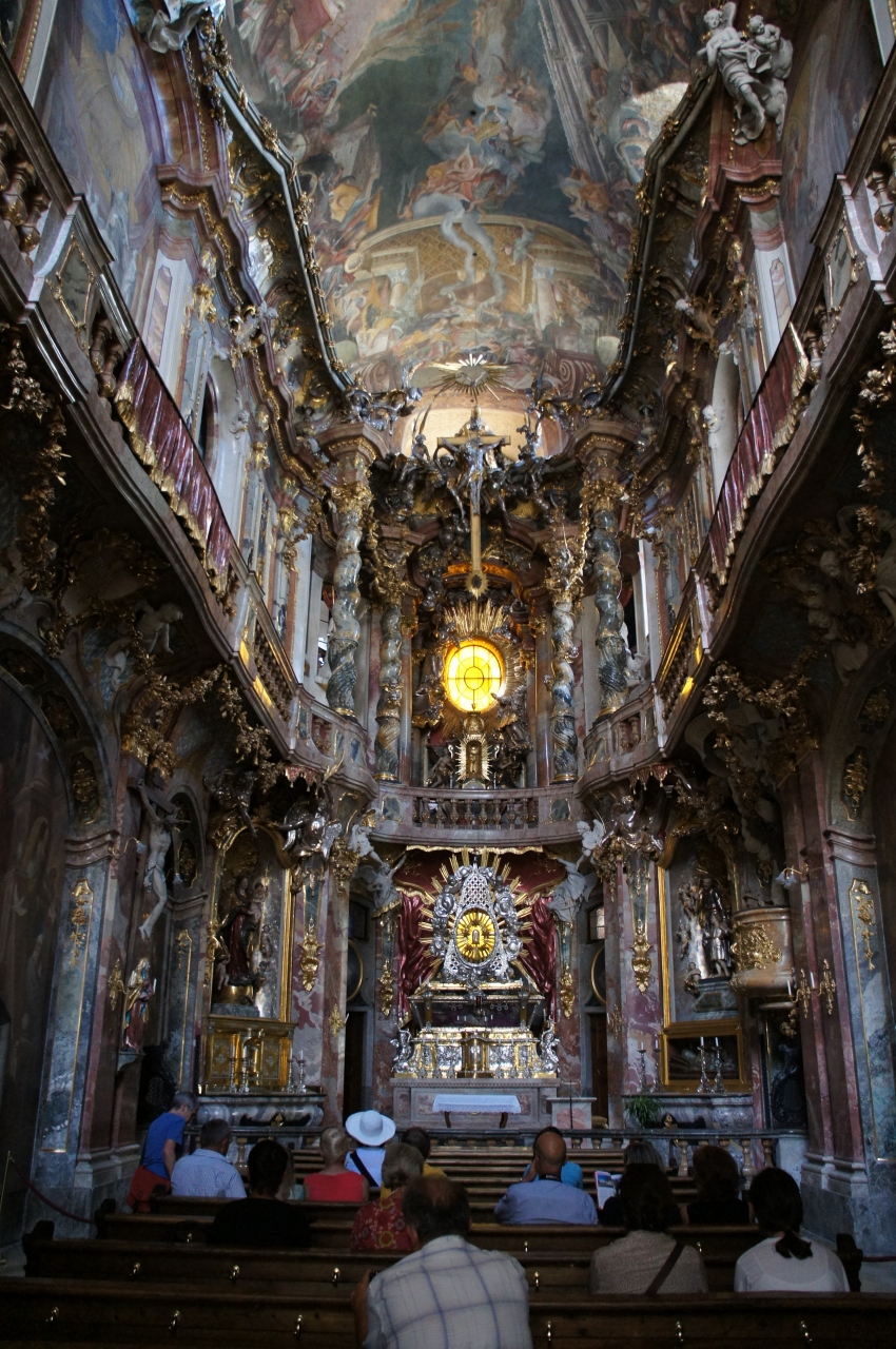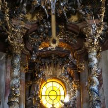 とにかく素晴らしい教会です。マリエン広場から500メートルほど、大きな通り(Sendlinger Str.)の普通のお店の並びにあります。外観はそれほど華やかではありませんが、中に入るとその荘厳な装飾に圧倒されます。アザム兄弟が贅を尽くして建てたプライベートな教会というのもうなづけます。ヴィース教会が白を基調とした明るい色彩の優雅な装飾なのに対して、こちらは暗めの色彩の重厚で厳かな装飾です。ヴィース教会よりも小さいけれど、勝るとも劣らない美しさなので是非少し足を延ばして行ってみることをお勧めします。隣のアザムハウスも(外観だけですが)お見逃しなく。