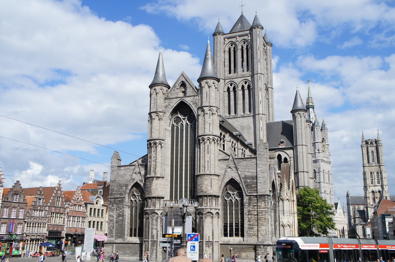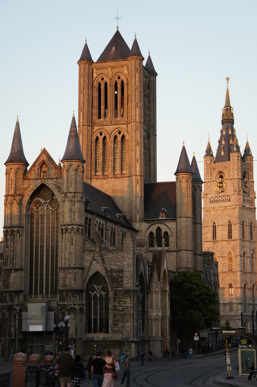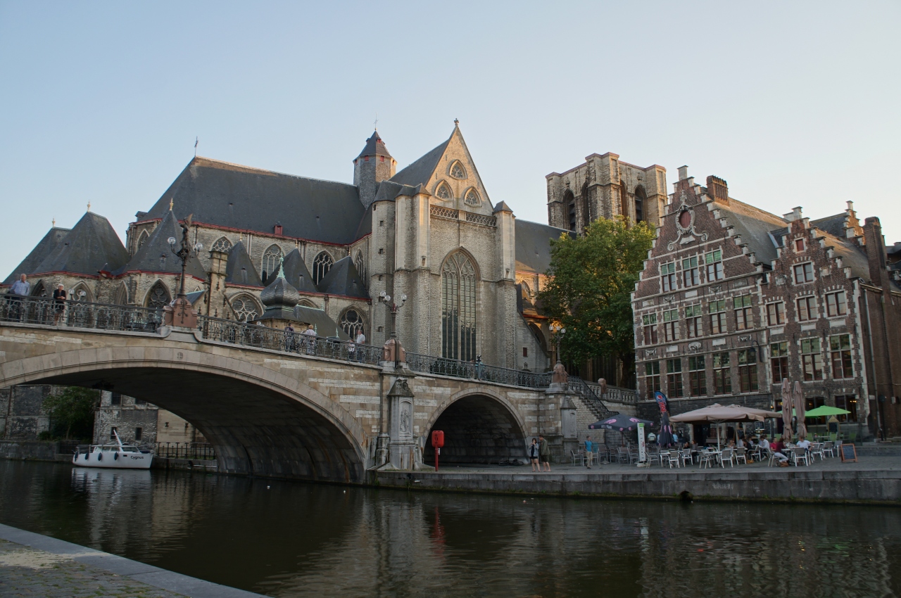 ここから、聖ニコラス教会と鐘楼、その向こうに聖バーフ大聖堂を1枚の写真に収めることができます。午前中は逆光になるので撮影は午後がいいです。夕陽に染まる光景もとてもきれいでした。また、クルーズのボートから見上げる橋も趣があって素敵です。時間を変えて何度か足を運んでみてください。