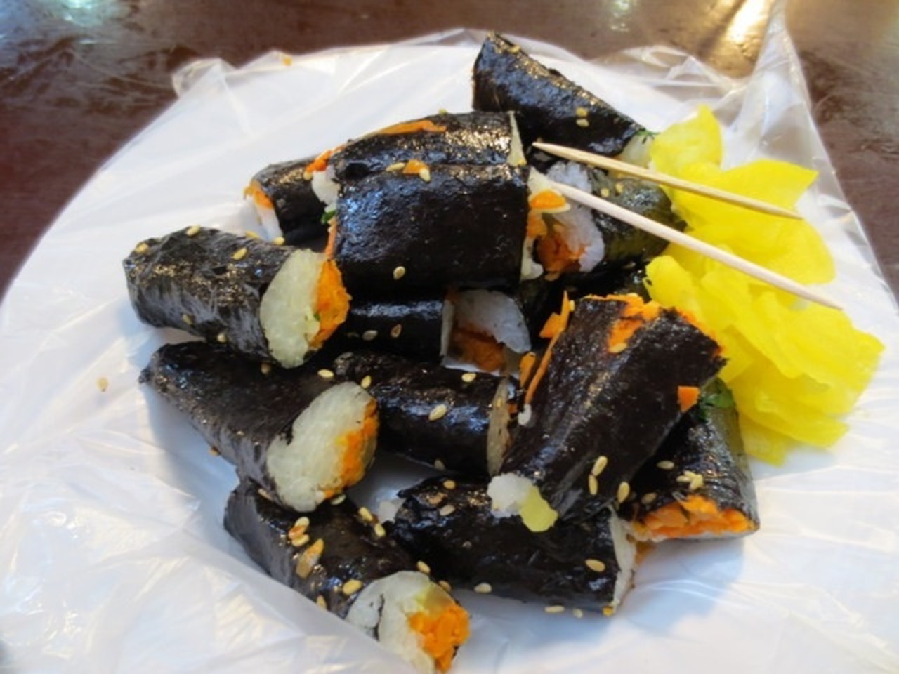 キンパのお店はいくつも露店で出てて迷いますが、わたしは元祖のお店を探した伺いました。でも、ほかのお店もたくさんお客さんがいて、きっとおいしいと思います。