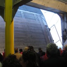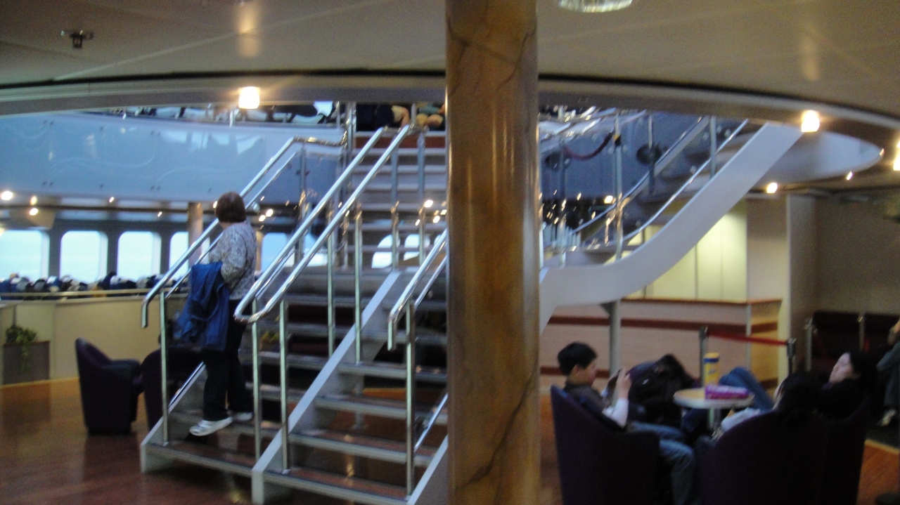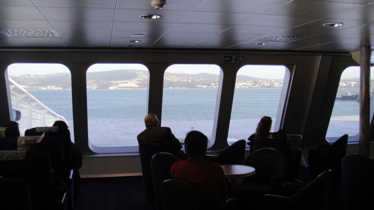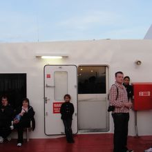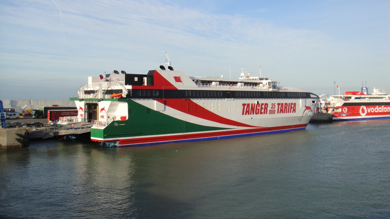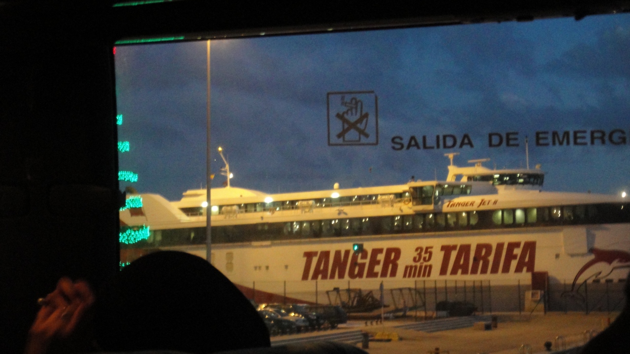 モロッコのタンジェからスペインのタリファまで利用しました。高速船で35分。行きのスペインのアルヘシラス~タンジェが2時間以上かかった普通便(ほかに出航の遅れなどが重なった)とは大違いの速さです。タンジェの港で勧誘されました。アルヘシラスの便の所要時間に辟易していたのと、あと15分くらいですぐ出航とのことだったので勧誘にのってみることにしました。料金は日本円で4,000円くらいだったと思います(当時、1ディルハム=12円)。ユーロ払いもできました。タリファからアルヘシラス(港)までの専用乗り継ぎバス代込みということでした。急いで事務所に連れて行かれ、パスポートを確認しながら出国書類を作成。フェリーターミナルでの荷物検査など出国手続きもあっという間。そして乗ってみるとこれがとても速く、昔、青森~函館を1時間半で結んでいた高速船(なっちゃんレラ)みたいな速さで海上をみるみる進んでいきます。それに船内は日本のフェリーみたいにきれい。夕暮れの中、離れていくタンジェの景色を後部甲板で風に吹かれながら眺めていました。それにしてもあっという間の船旅でした。タリファに到着すると、車も出る船倉の横から降りるのが少しいただけない感じがしますが、フェリーターミナルで入国審査後、ターミナル横に待っていた連絡バスで20分あまり。あっという間にアルヘシラスの港に到着です。おかげでアルヘシラスでゆっくり食事をする時間がとれました。料金は普通便の3倍くらいしましたが、ノンストレスで大満足です(普通便では船内のロビーで長い行列を作って入国手続きです。所要時間も長かったですが、手続きのため立って並ぶ時間も長くて疲れました(審査員ノロノロ)。まあ、安い船会社を選んでしまったのもありますが…。)。