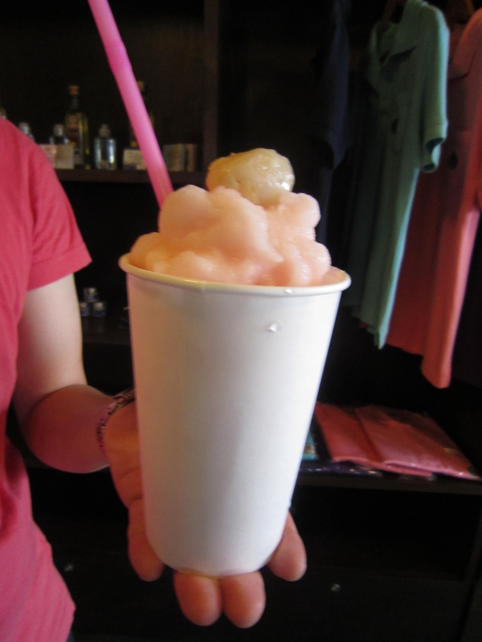 カフェのライチスムージーは30Bで量も多くお買い得です。暑いから美味しかった。この奥にトイレがありました。でもとても汚いです。