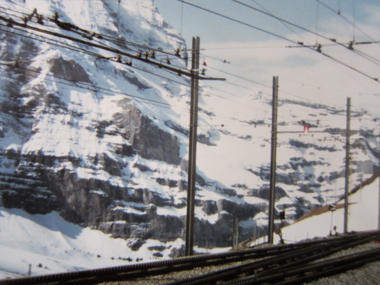 グリンデルワルトからユングフラウヨッホを目指して鉄道に乗りました。ここは乗換地点です。電車の窓からも、アイガーの雄大な姿が近づいてきていましたが、ここに降りると目の前にそびえていて、ぞくぞくしました。2016m地点です。