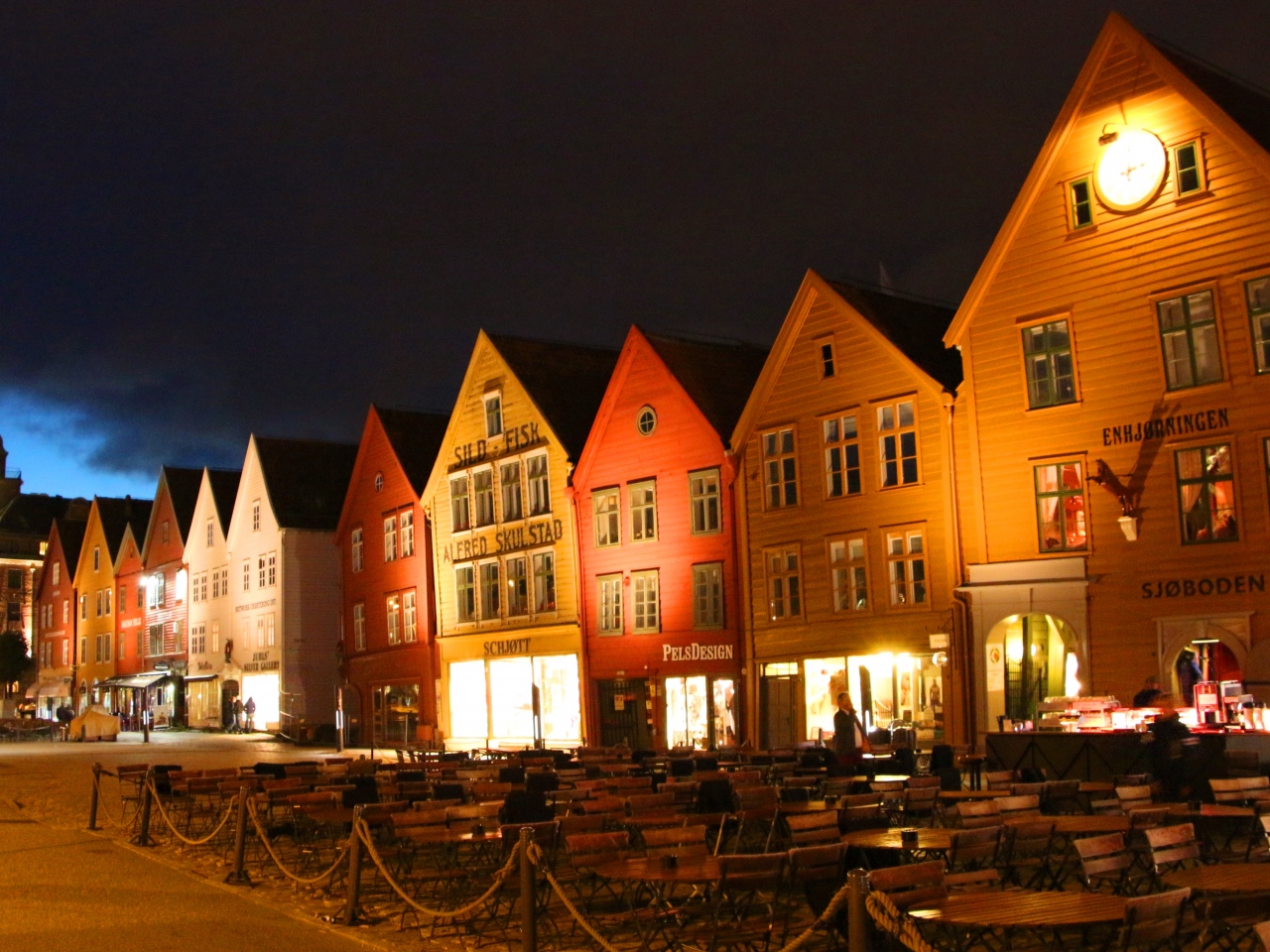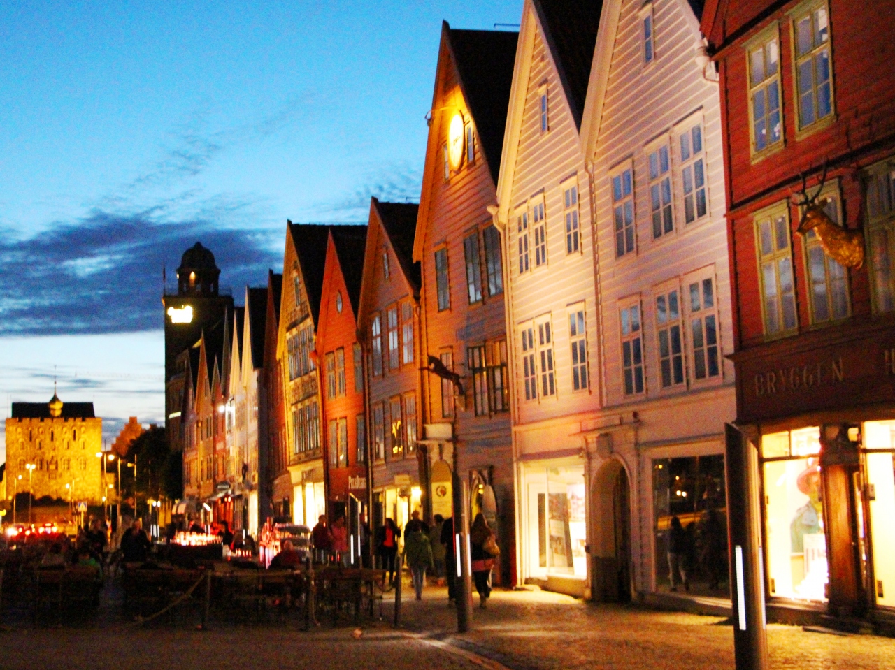 日没の直前には、埠頭の木造家屋や近隣の煉瓦の建物がピンク色に染まり、なかなか素敵な風景が見られます。お土産屋さんも店舗によりますが、21:00、22:00まで営業しているところもあるので、お土産を買うついでにブリッゲンの木造建築を見に行くのもいいかもしれません。