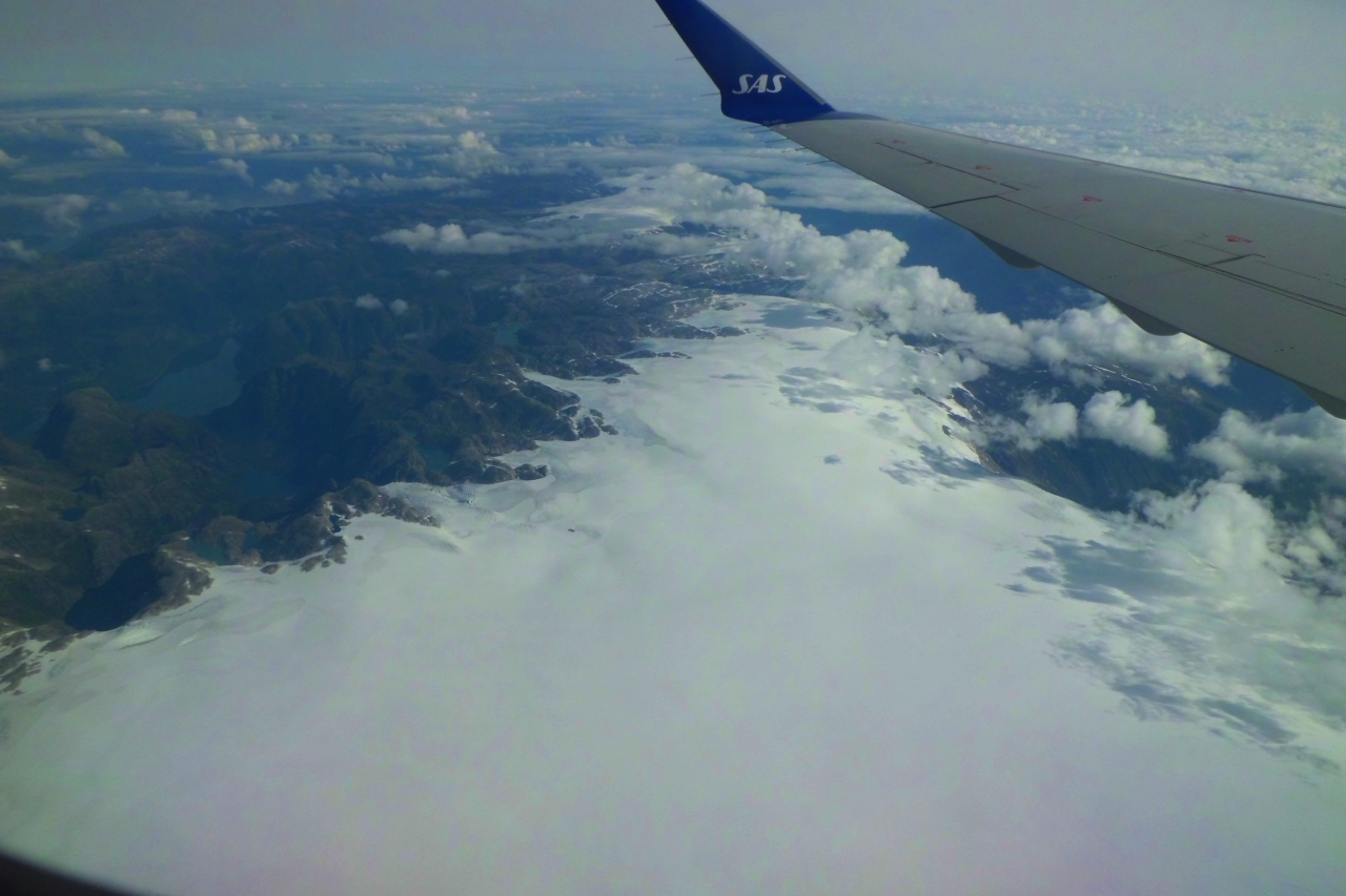 蒼のフィヨルドと山々、そして下界からは決して眺めることができない大氷河(氷原)が眼下に広がる。