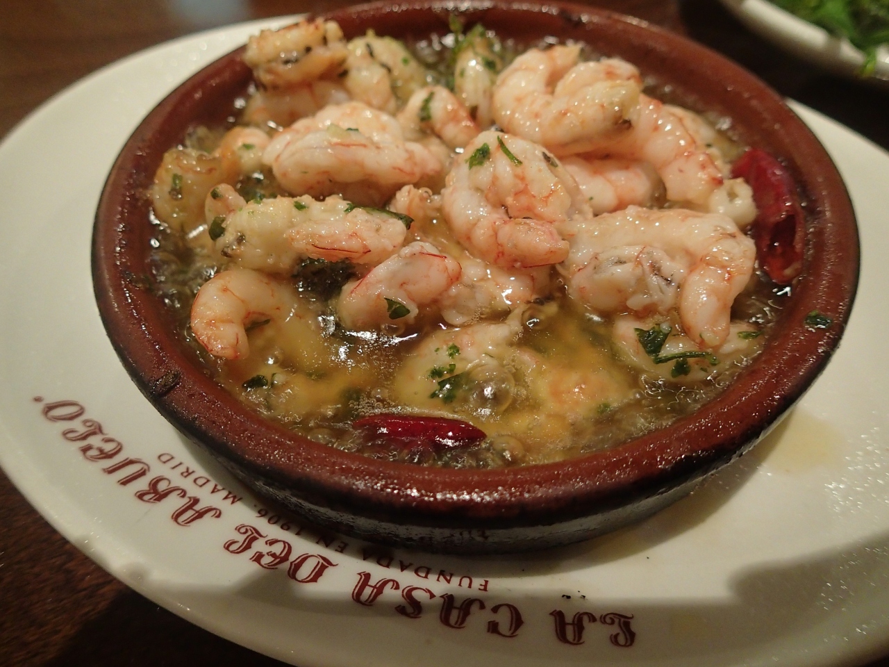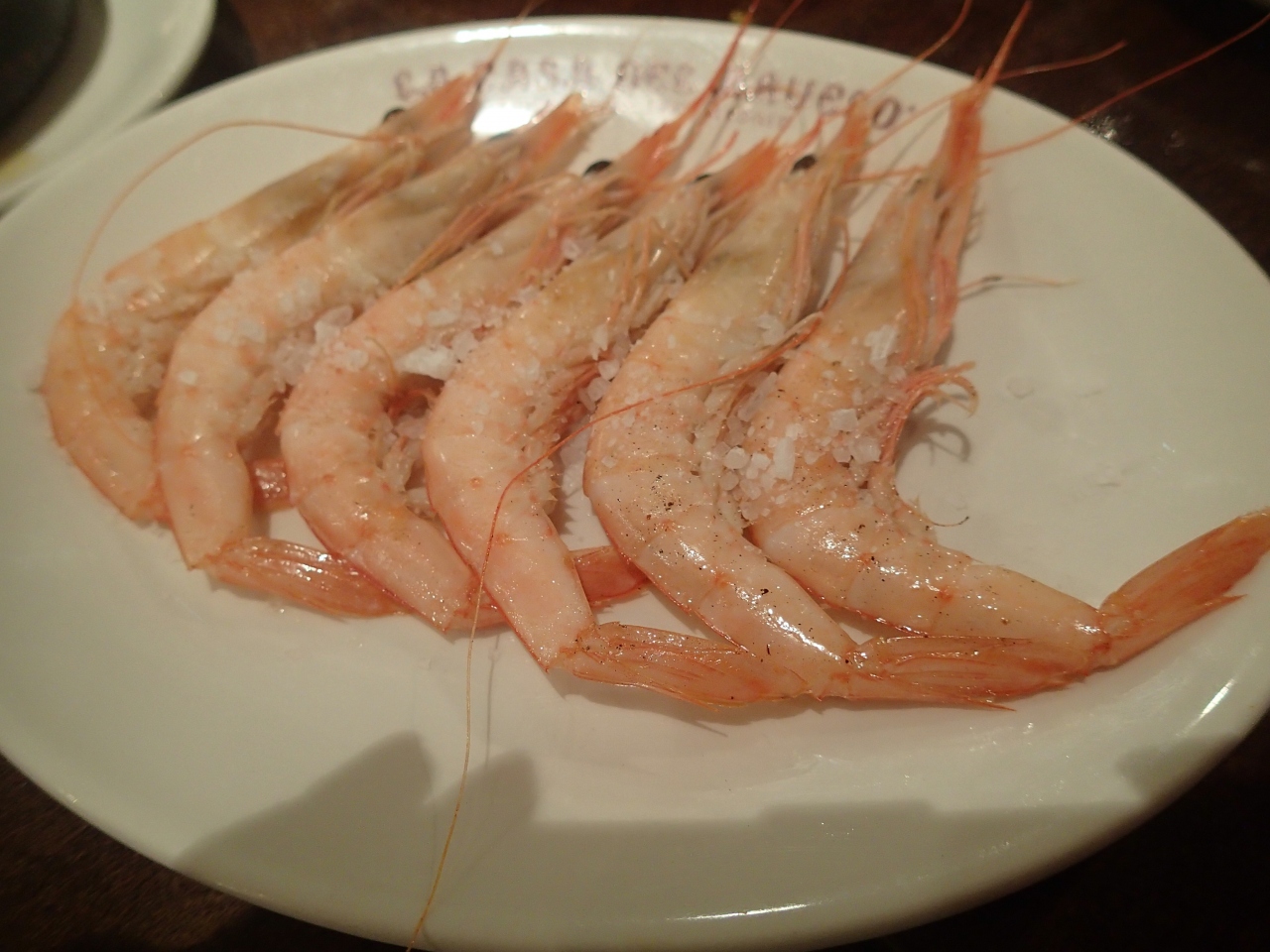 GAMBAS AL AJILLO(エビのニンニクオイル煮)8.9ユーロ、 GAMBAS AL PLANCHA(エビの鉄板焼き)9.1ユーロ、 PIMIENTOS DE PADRON(シシトウみたいなピーマンの素揚げ)7.2ユーロを注文。