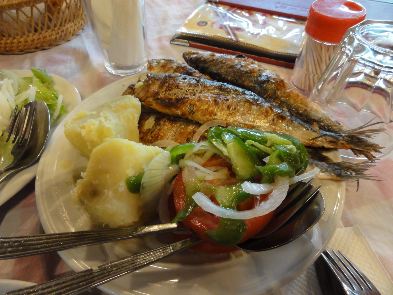 注文は2人で、イワシ、焼き豚、サラダを注文しました。イワシにも、焼き豚にも付け合せの野菜がかなり多く乗せてあり、その内容がサラダと全く同じだったので、サラダは注文して後悔しました。1皿の量が多いし、ここで提供されるパンがおいしいので、料理は2人で2つでよかったかな。