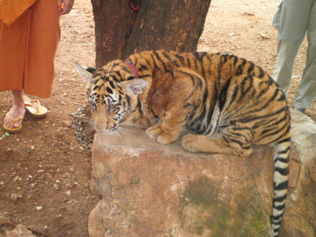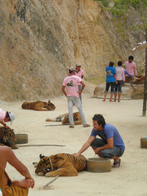 大人のトラは迫力がありすぎて近寄れない。遠くからいっしょに写真をとってもらえます。子供のトラはかわいいですよ。ほかに牛なども飼っているようです。