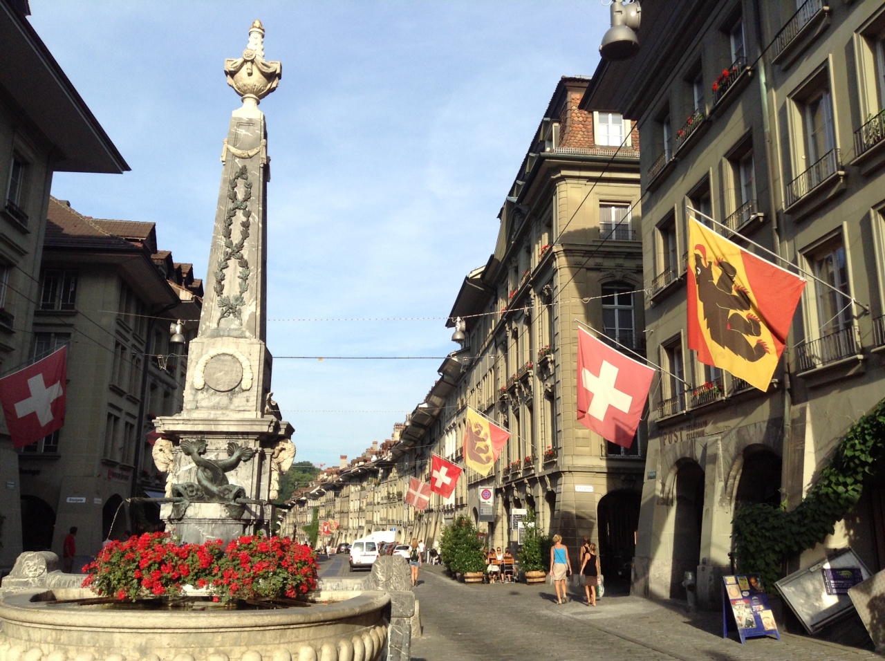 石畳の道、その道の真ん中にいくつもある歴史のある噴水、アーケード、はためく旗、レストランのテラスのテーブルセッティングに至るまで、おしゃれでいい雰囲気です。かつては倉庫だった半地下のお店やその扉も素敵。ヨーロッパの主な町の中でも、特にいいと思います。