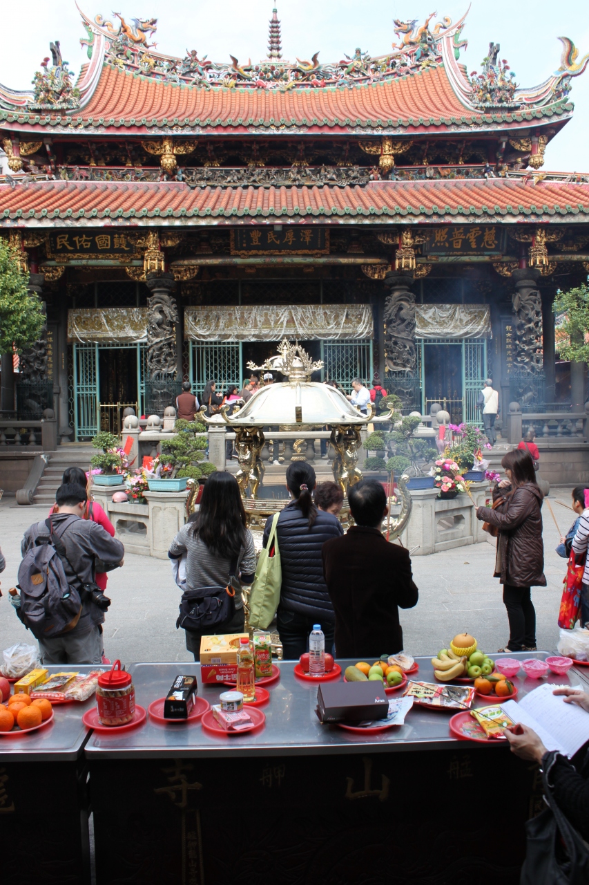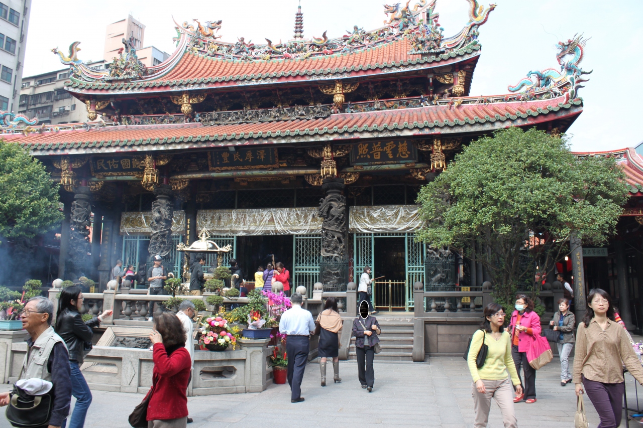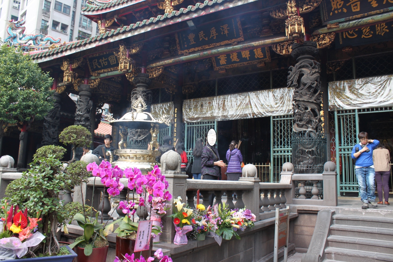 地下鉄「龍山寺」駅を降りて2~3分で着く。有名なお寺なので台湾に来たからには敬意を表さねばと訪ねた。こちらの人はとても信心深いように感じた。特に若い人の姿が多いように思えた。彩りの華やかな花々、果物、日々の暮らしの中の食料、菓子類など様々なものがお供えとして持ち込まれていた。そして手に手にお線香を持ち、静かに頭を垂れてお参りする姿は国民性を表しているように感じた。旅行者は友人でもいないと、その国に旅しても、普段の国民の生活に触れることは少ないが、こうした場所ではそれを感じることが多い。