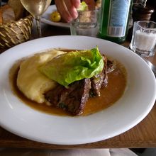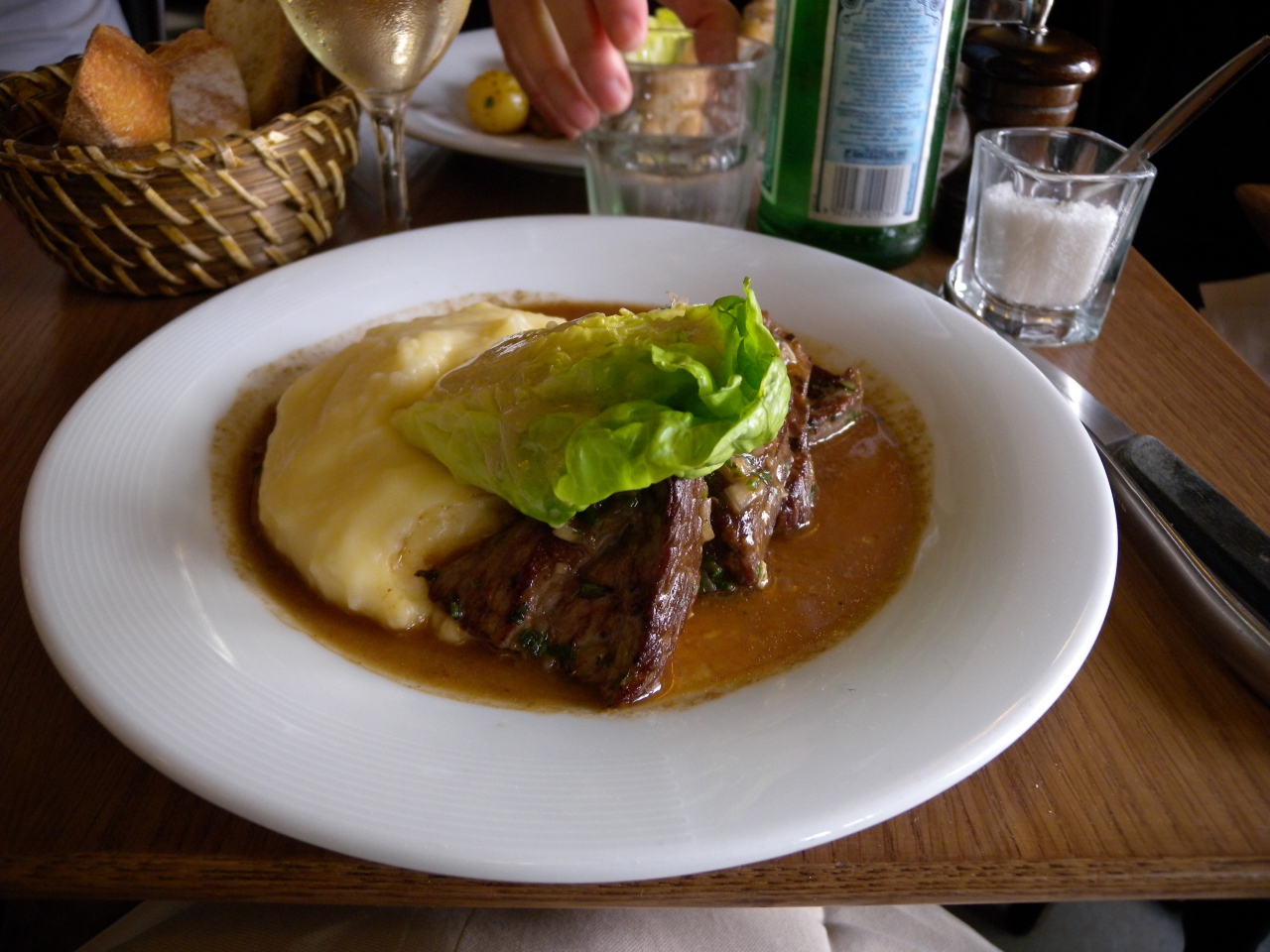 口コミで有名な Cafe Constant でランチを頂きました。エッフェル塔から公園を通り抜けて15分程度でしょうか。12:30頃ついて2Fに通されましたがテーブルを動かさないと奥の席に座れないほどの配置。店の外のテラス席の方がゆったりできそうでした。ランチメニューがお得との口コミでしたが、メニューにはなかったようで、前菜 メイン デザートが別々に書いてあるようでした。今回はメインと飲み物だけを注文しました。牛肉煮込み+マッシュポテト+ゆでキャベツと鳥のグリル+ジャガイモ+ゆでキャベツで両方ともに16ユーロ、白ワイングラスと炭酸水は5ユーロでした。おいしかったですが、期待していたランチが無かったのが残念。なお、お会計はテーブル席でチェックをもらい一階のレジで支払でした。