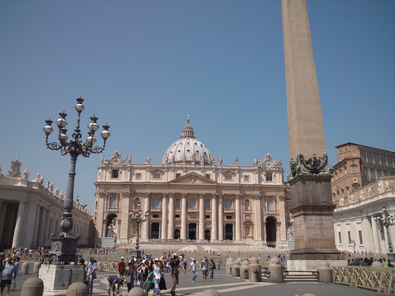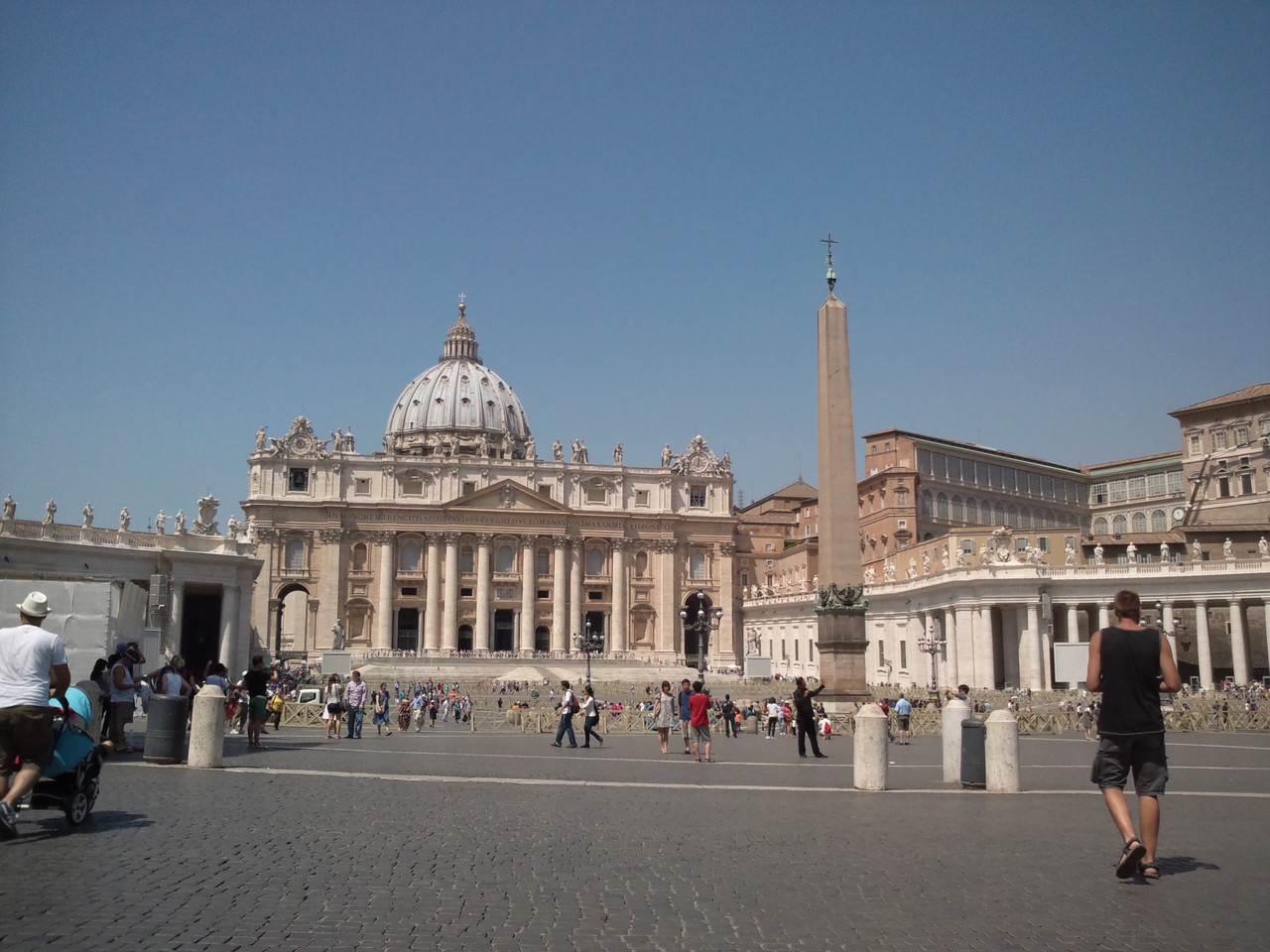 楕円形の美しい広場で、大聖堂の入り口はこの広場の奥にあります。日曜日はミサがあり世界各国からの信者で込み合いますが、他の日は自由に広場には入れます。広場を囲む大柱は美しく、見る角度によっては4本の柱が1本にみえるそうです。