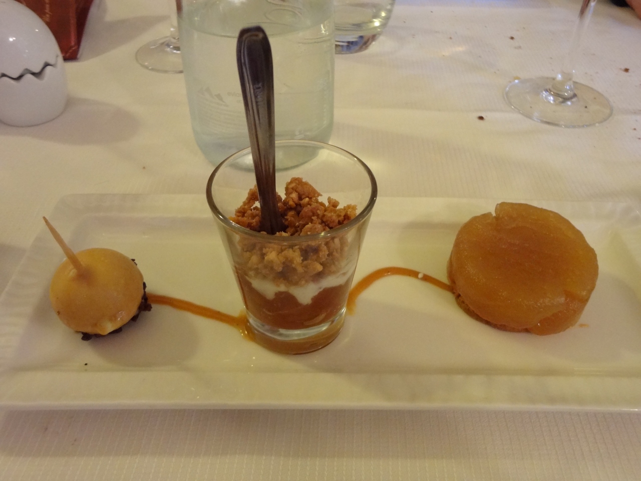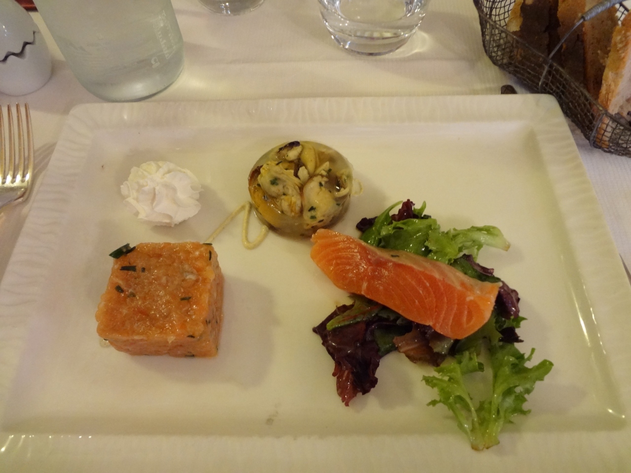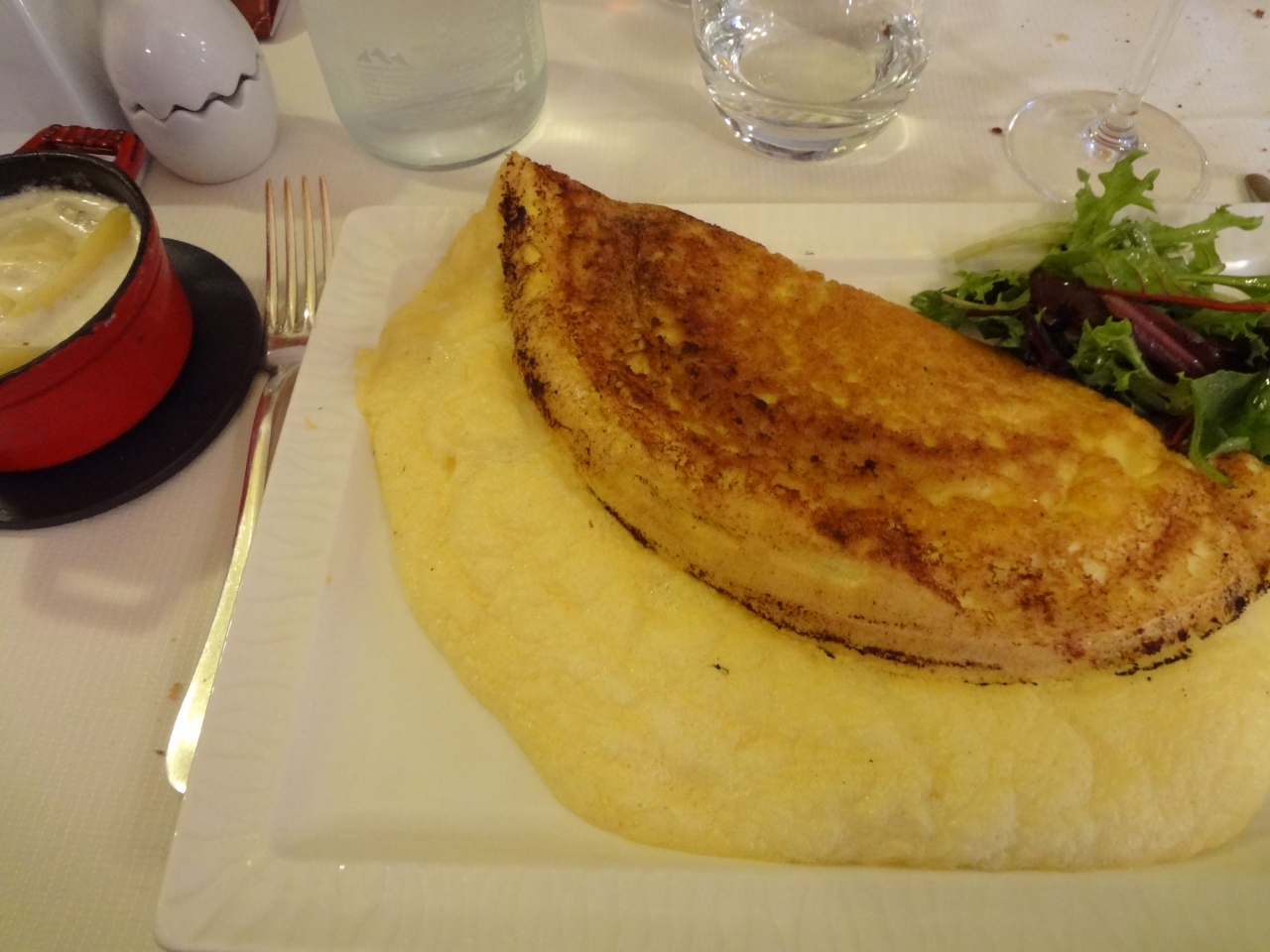 モンサンの有名店、昼時にたまたま空いてたので入りましたが、予約で早くて2時。島内宿泊だったので、観光をして2時に店内に。そこから待つこと30分(席は空いてるのに)。やっと狭い席へ案内されメニューをみると、外のメニューにあった単品のオムレツがない!ランチタイムが終わったの?フランス語わからず、オムレツのコースメニュー(ひとり5000円)。二人なので、違うメニューを頼みました。