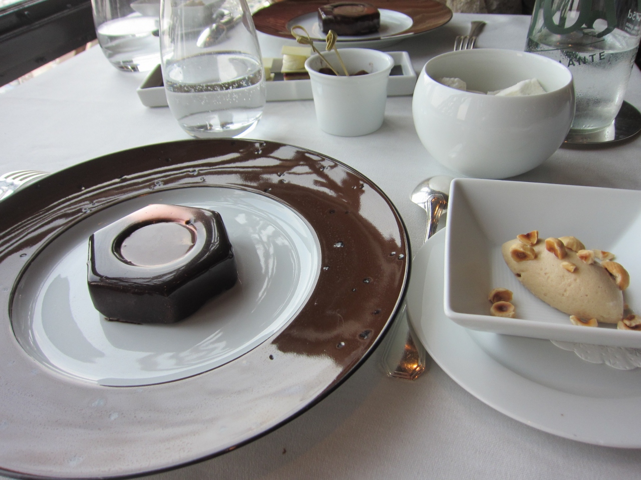 アラン・デュカスが指揮する、エッフェル塔展望台にあるレストラン。専用エレベーターを待つところから、素敵な時間がスタートしました。おいしいランチコースに、エッフェル塔からの絶景がセットなのですから、満足度は100%。何ユーロか追加して、デザートをチョコレートムースに替えましたが、これも大正解。チョコのテカテカ加減が伝わりますか?
