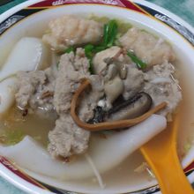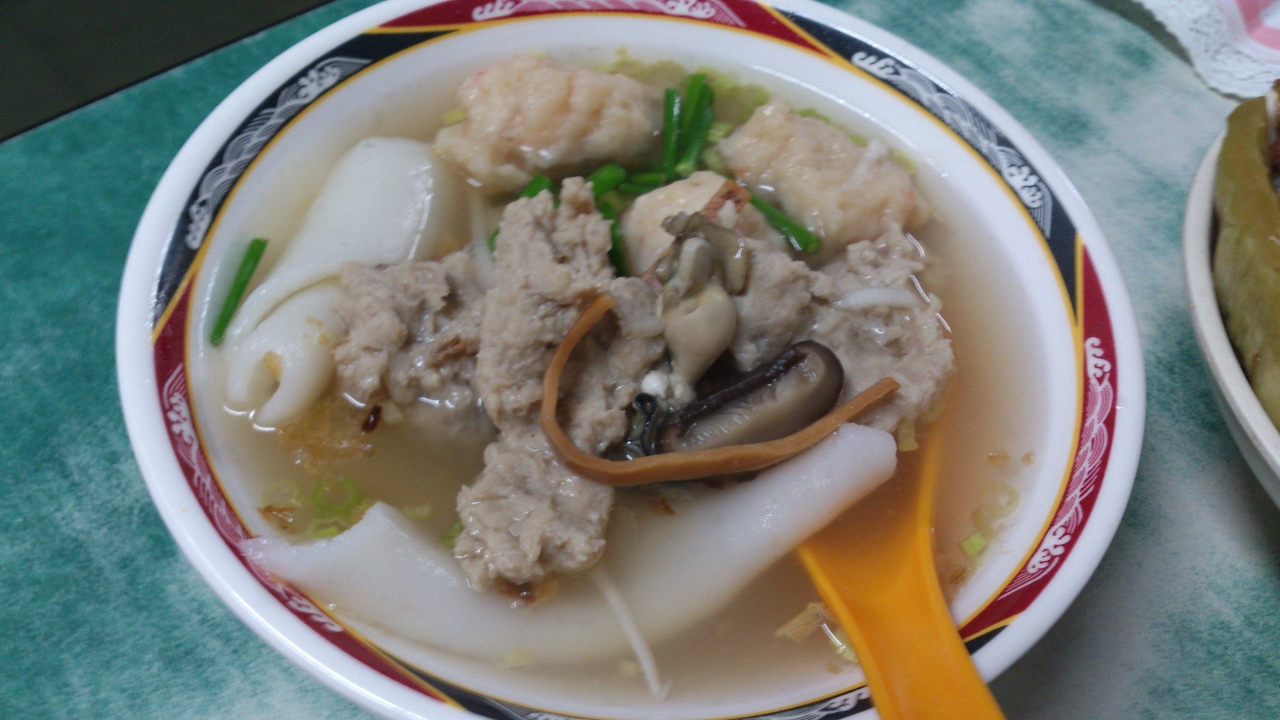 ランチのラッシュになる前に入店して、定番のしいたけ入り魯肉飯、汁なしビーフン、煮卵、ゆで野菜と 麺が入ったスープ(鼎邊銼)を注文した。ビーフンは台湾風で、非常に細いけどちゃんとこしがあり、よく魯肉と汁と絡んで、おいしいです。が、鼎邊銼というスルメからだしを取って、米粉で作った麺が入ったスープはあまりに口に合わないんです。台湾牡蠣や魚やエビのすり身、いろんな食材でだしを作ったけど、なんかあさっりすぎで、パンチがあってほしいなぁ。