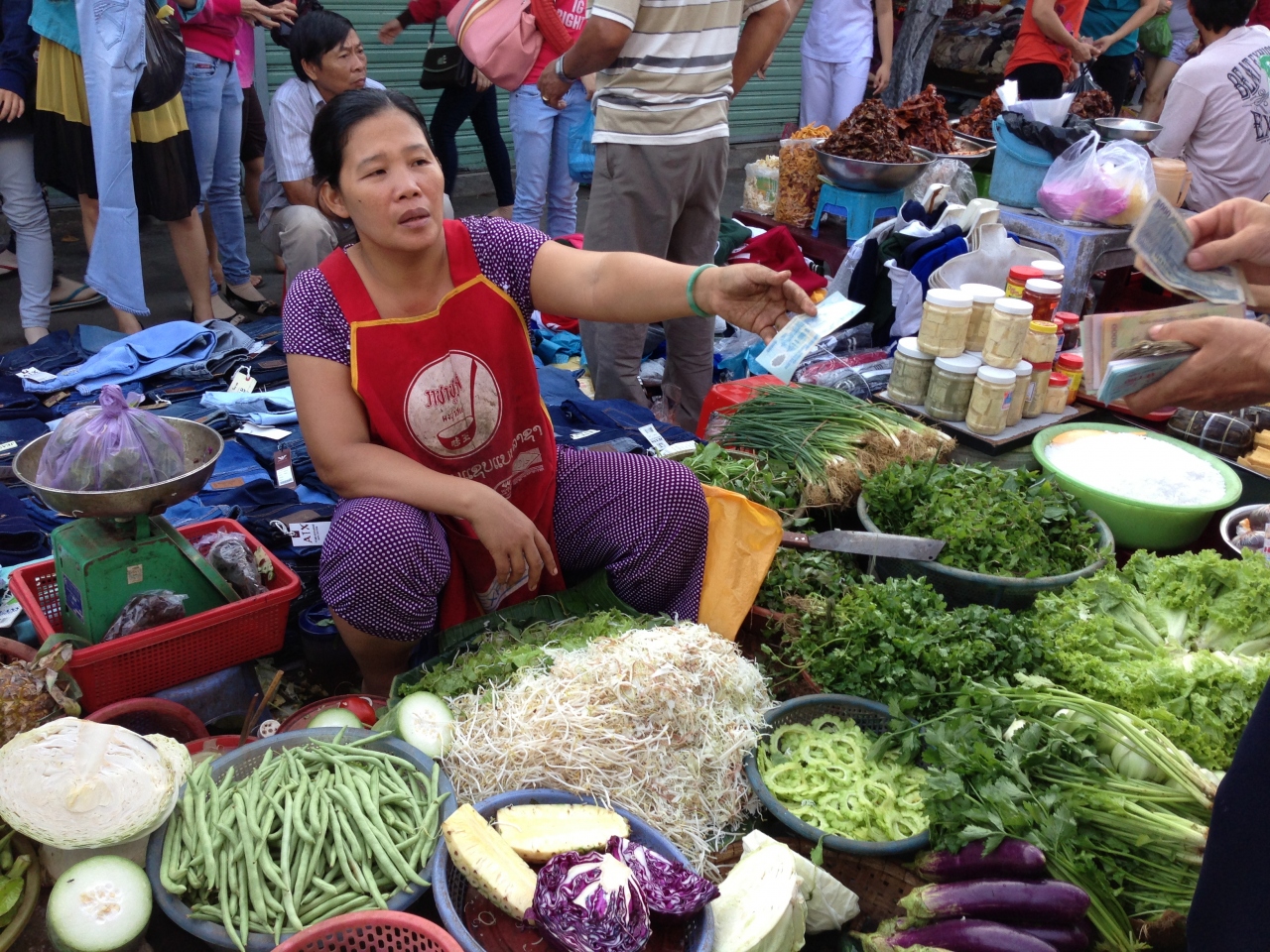 屋外は、開放的で野菜や惣菜を売っている店が多く出ており、現地の人が買物および食事をしています。