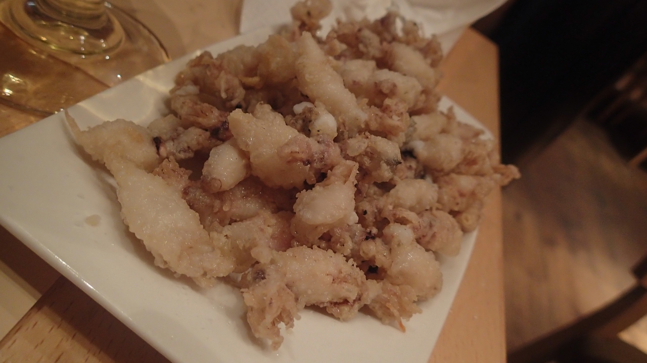 ■小イカのフリット(9.95ユーロ)はカリっとクリスピーに揚がっていますが、イカ自体の素材の味がない(この料理を食べたのが3店舗めだったのですが、どこもそんな感じだったのでスペインの小イカは元々味があまりしないものなのかもしれません。ホタルイカとは全然違うイメージです)