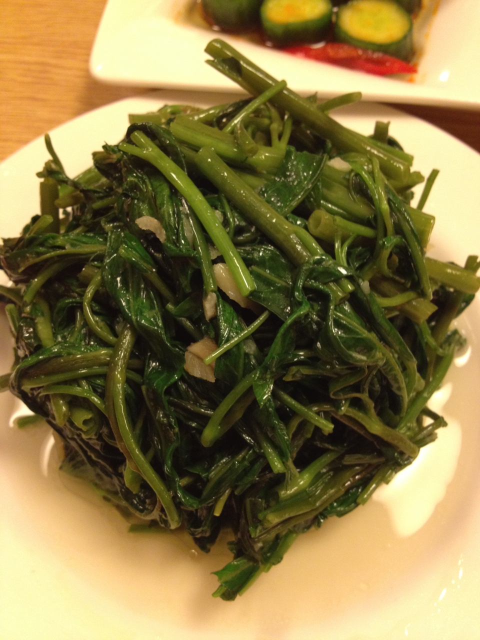 空芯菜炒めも間違いのない味。じゃじゃ麺も、お酢をかけておいしくいただきました。