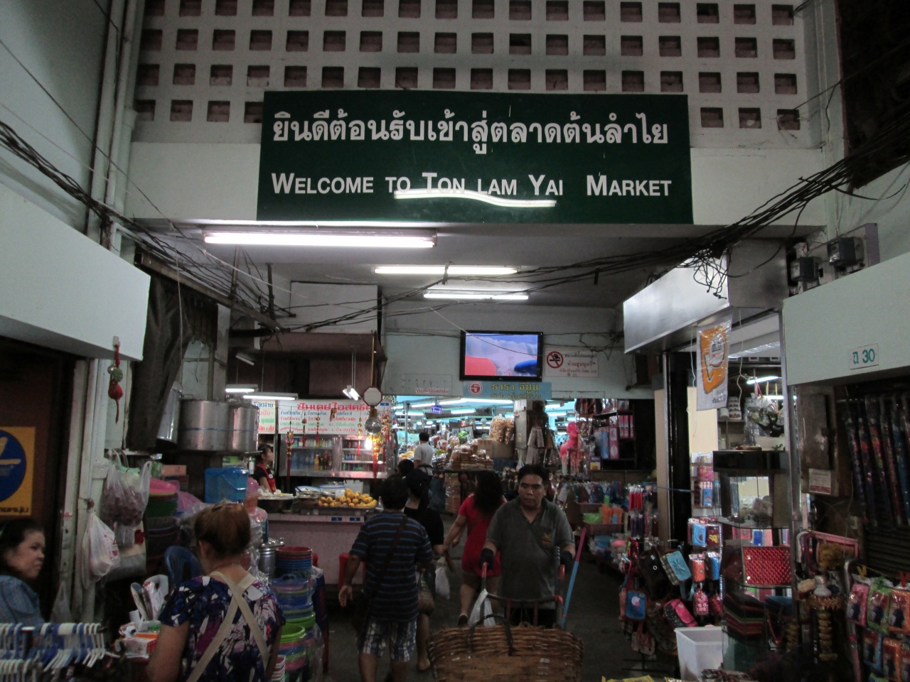 ワローロット市場と通りを挟んだところにあるトンラムヤイ市場です。通りの西側がワローロット市場。東側がこの市場です。二つの市場は歩道橋でつながっています。ターペー門から徒歩で行けます。生鮮食料品や花、衣類、日用品などがありました。