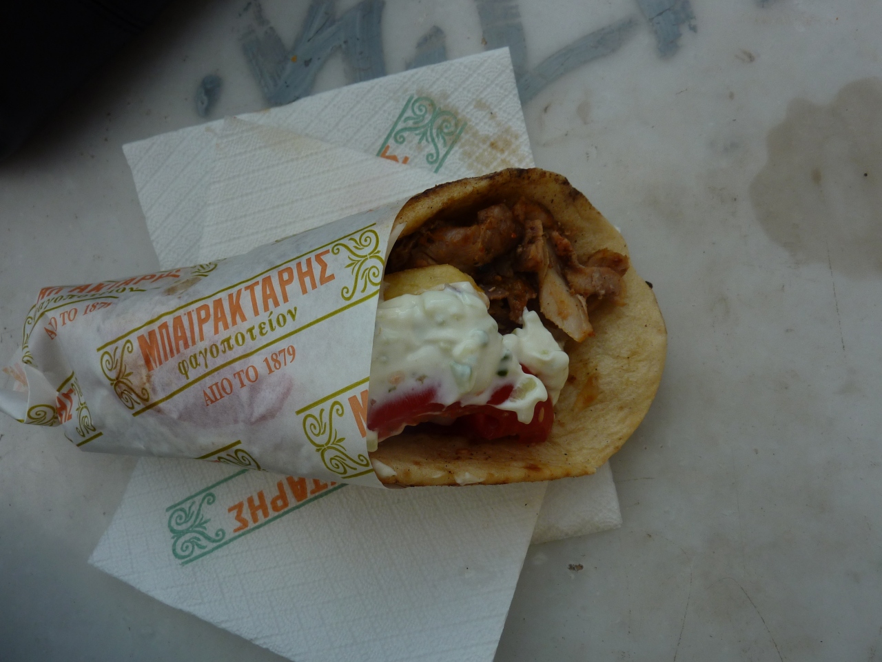 ででんと看板替わりの肉の柱が立っていて、これをそぎ落としたものをもっちり肉厚のピタで包んで、太目のフライドポテトと薄切りトマト、スライスオニオンと美味しいマヨネーズ風味のソースがかかってボリュームたっぷり2.2ユーロ。