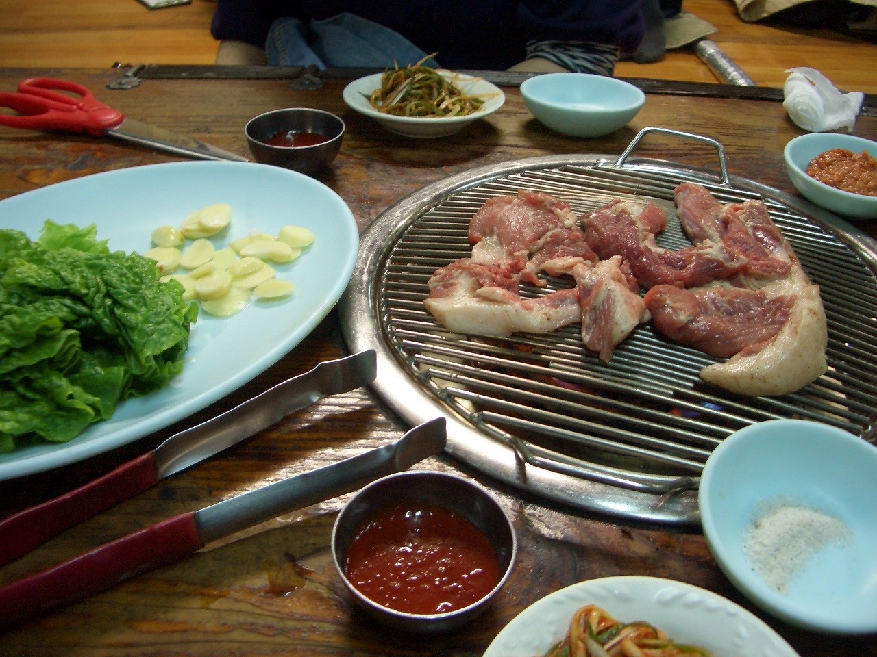 看板メニューの、首肉の塩焼きとテジカルビをいただきました。チシャやキムチなどもどんどんでてきますので、女性二人だとこれぐらいでちょうどいいです。