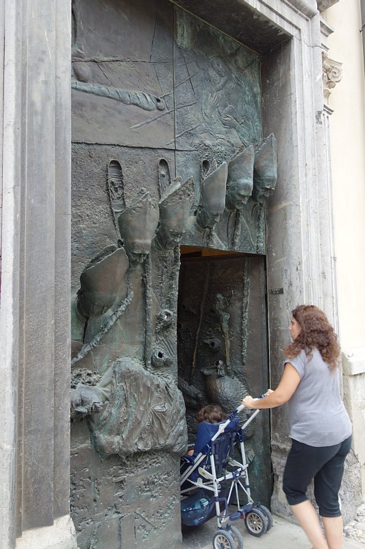 入り口にある扉は銅像の一部がドアになっているような面白い構造。出入りしている人がいなければ、ここがドアになっているとはとわからないも?