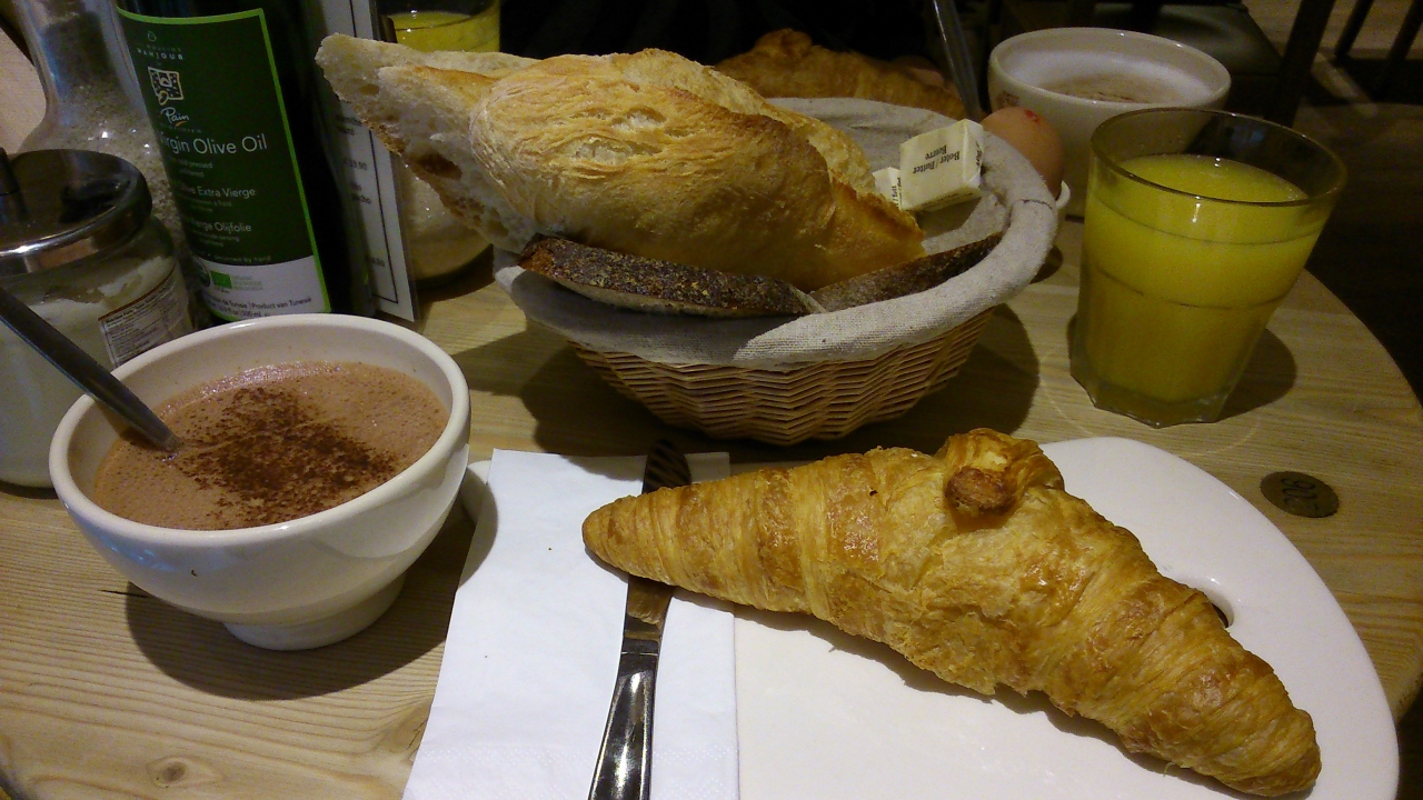 10ユーロもしないで、パン数種類とオレンジジュース、暖かい飲み物がついてきます。