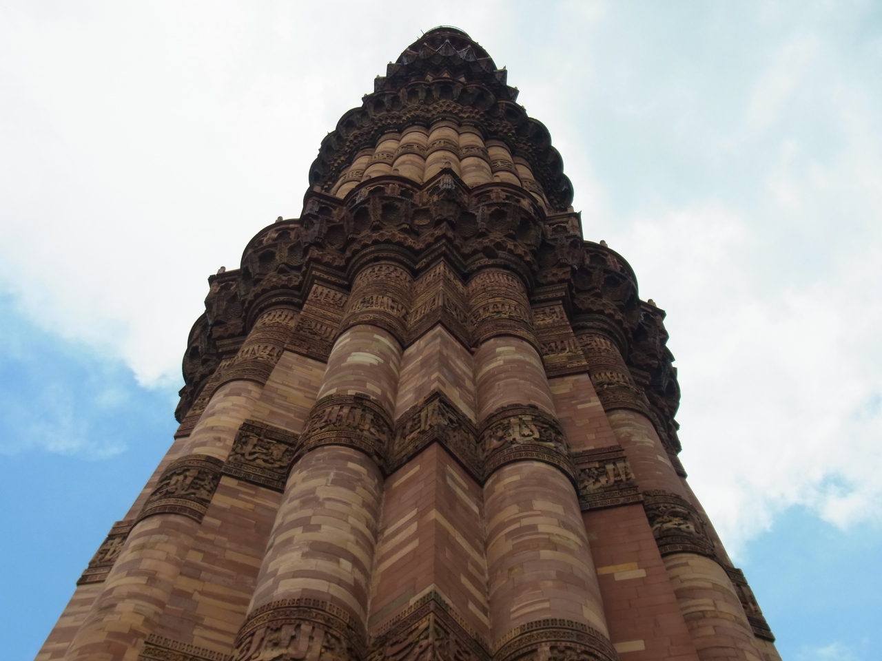 クトゥブ・ミナールは「勝利の塔」という意味のインドで最も高い高さ72.5mの石造の塔で、奴隷王朝初代皇帝アイバクが初のイスラム王朝を成立させたことを記念して建てられたものだそうだ。赤とベージュの砂岩でできていて、5層からなる塔の壁には、コーランの章句などが刻まれているとても美しい塔だ。その傍らには、クワットゥル・イスラーム・モスクがある。破壊したヒンドゥー寺院の石材を再利用したため、回廊の列柱に女神像が残り、ヒンズー様式とイスラム様式が混在している。その他、モスクの中庭にそびえるチャンドラヴァルマンの鉄柱や均整のとれた美しい門アライ・ダルワーザなどがあり、狭い中に見どころが満載している。直径が 25メートルもあり、完成していればクトゥブ ミナールより大きくなったであろうアラーイ・ミナールの土台も見れる