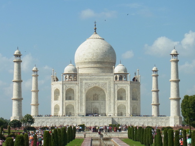 アグラにある世界遺産『タージ・マハル』はムガール帝国第5代皇帝シャー・ジャハーンが愛妃ムムターズ・マハルのために建設した大理石の霊廟だ。惜しげもなく宝石が嵌めこまれ、2万人の職人が22年もの歳月をかけて作った世界一ゴージャスな墓と言われている。その大きさと青い空をバックに白く映える気品ある美しさに感動した。中にはシャー・ジャハーンと愛妃ムムターズ・マハルが仲良く眠っている。二人の遺体は地下に葬られており、1階にある棺はダミーらしい。シャー・ジャハーンはこの川の対岸に自分の黒い霊廟も造ろうとしたらしいが、やがて息子によってアグラ城に幽閉され、夢果たせずそこで亡くなる。無念だっただろうが、いまは一緒に葬られて本望だろう。タージ・マハルは満月の夜の前後2日だけ夜間参観ができる。その時にまた是非訪れてみたいものだ。