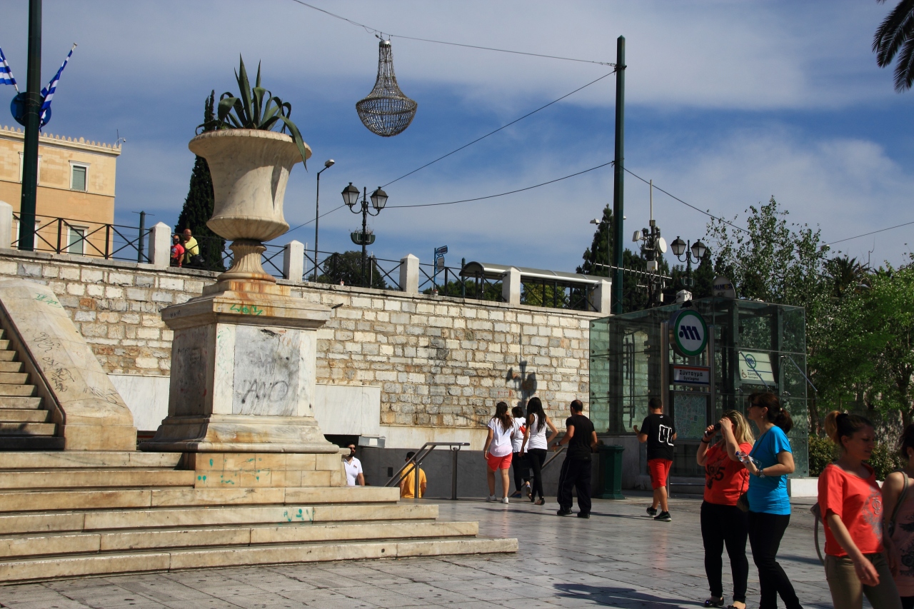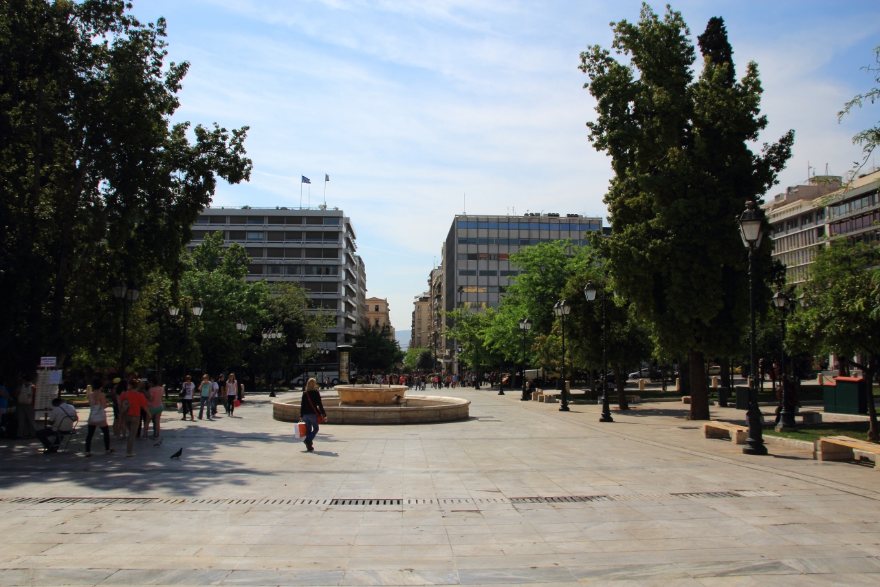 アテネの市内を回るときに必ず通るといっていい広場がシンタグマ広場です。広場の中央には公園があり、また正面には無名戦士の墓、そして更に奥には国会議事堂があり、当然警察や衛兵が四六時中監視していますので、現在治安悪化が著しいギリシアではありますが、この広場の周辺は非常に安全になっています。