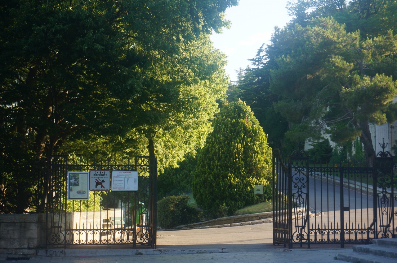アビニョン旧市街のメイン通りを真っ直ぐ歩いて行くと、広場に出ます。右に大きな建物法王庁宮殿、正面にプティ・パレ美術館があります。法王庁の先に坂道がありますが、その坂道を上がっていくと、、ロシェ・デ・ドン公園の入り口があります。公園の展望台からはサン・ペゼネ橋が一望出来ます。