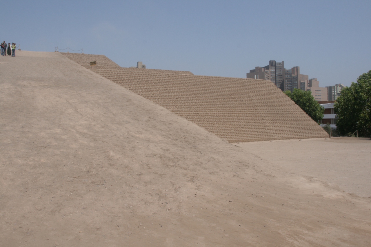 住宅街を進んで行くと、急に、日干し煉瓦を積み重ねた遺跡が現れます。砂丘となっていたので宅地開発されることなく残った様です。また、砂に埋もれたので日干し煉瓦でも現代まで残ったのでしょう。旅行本にはリマ文化の遺跡と書かれていますが、プレ・インカの文化の1つとのことです。最上部へ続く真っ直ぐな傾斜道を登っていくと、何かの祭礼をやっている様な厳かな気持ちになってきます。