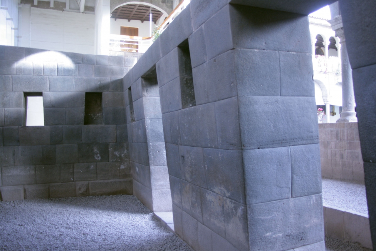 ここはインカ帝国時代、コリカンチャ神殿があり、政治と宗教の中心となっていた場所と云われています。ケチュア語でコリ(Qori)は黄金、カンチャ(Kancha)は居所と云う意味ですから、正に、黄金のある場所となります。スペインがここに侵略してきた時、外壁には幅20cm以上の金の帯が巻かれていたのです。そして、建物の中に入り、広場に出ると黄金の畑が拡がり、そこには黄金のトウモロコシが植わっていたのです。黄金の泉からは水がサラサラと流れていました。また、黄金の等身大のアルパカを連れた人間像がありました。そして、神殿の間には黄金の太陽の祭壇があり、分厚い黄金の太陽像が陽の光を受け、まさに黄金色に輝いていたのです。おそらく、世界の歴史上でもっとも黄金に輝いていたところだったのでしょう。スペインはウハウハの略奪し放題だったことになります。