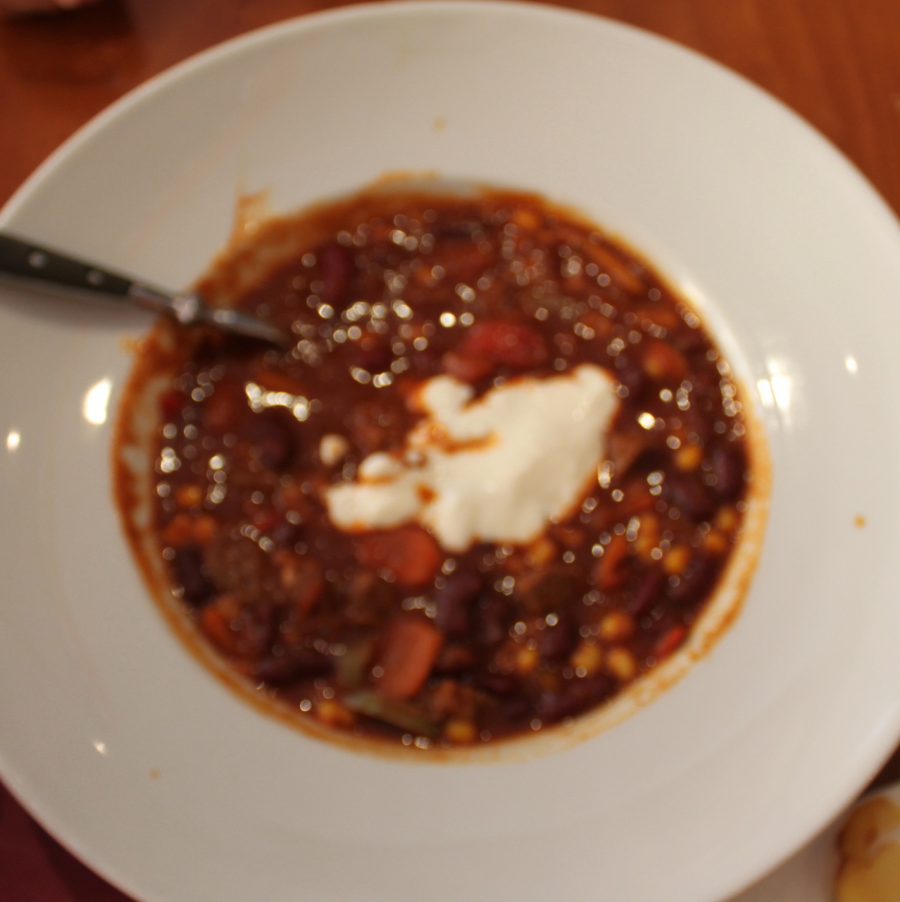 で、頼んだのは、チリコンカンとポークの煮込み。それにサラダ、スープとパンがつく。これを2人で分け合う。