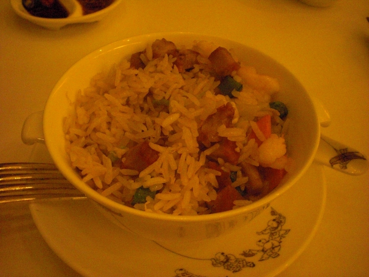 コースセットで頼みましたが、おそらく男性でも食べきれないような量のお料理でした。印象的だったのは魚の皮のスープ(不思議な触感のコラーゲン質?のような)。中華って、おもしろい食材がありますね。北京ダックもおいしかったし、チャーハンは金華ハムがたっぷりでぱらぱらで、おいしかったです。食べきれなかったら、お部屋に持って帰ることができます。