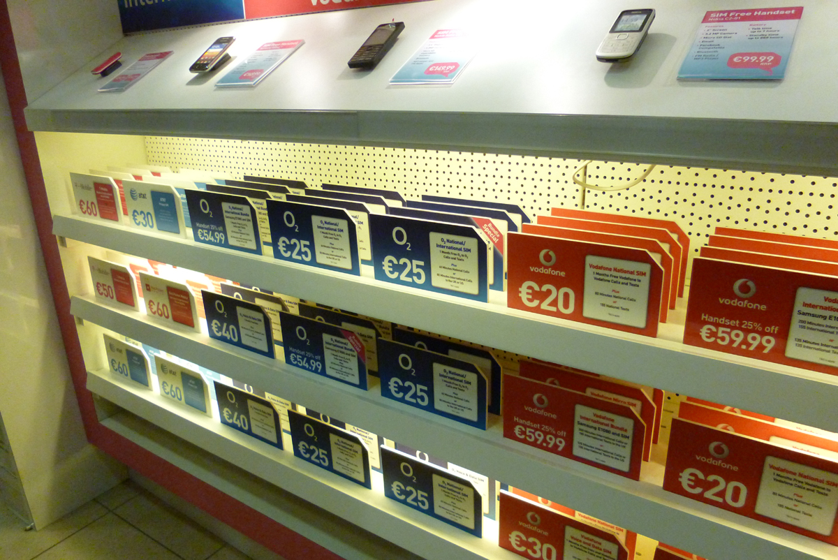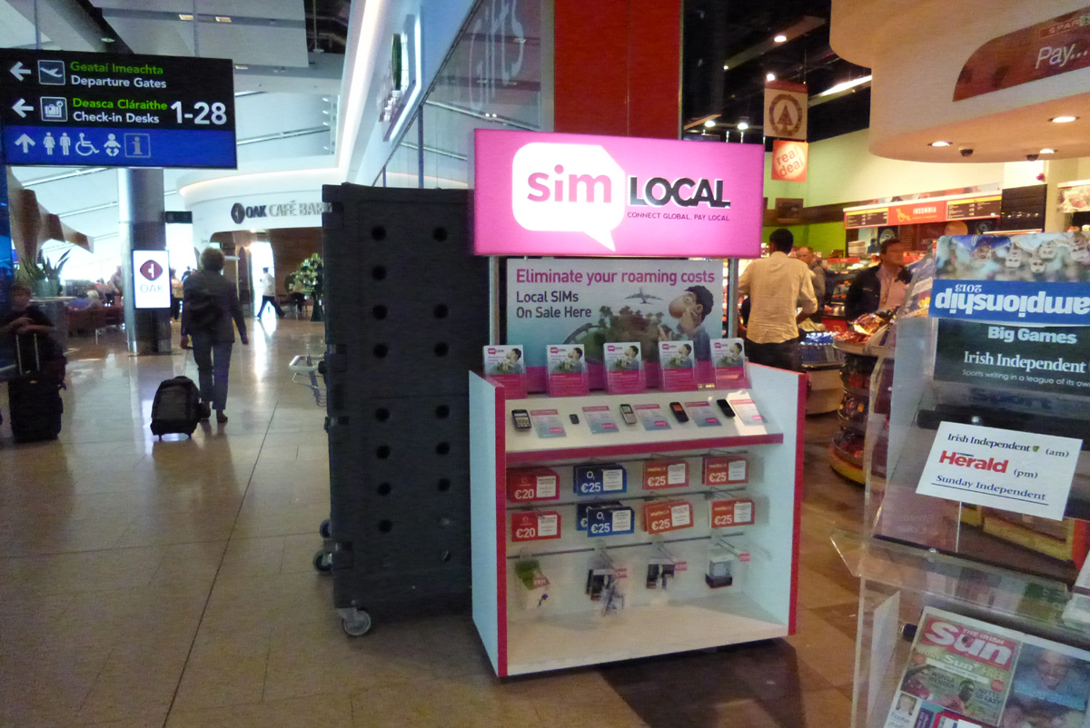 ダブリン空港でSIMカードを購入する場所は次の通り。海外から到着する際に主に利用する第2ターミナルの場合、出口右脇に有るコンビニSPERのアイテムとして購入可能。第1ターミナルでは、ターミナル出口左にある専用ショップ「SIM-Travel」で購入が可能です。なお、購入できるカードは、Vodafone、O2、Meteorの3種。安価なスリーは市内の専門店でのみ購入できます。