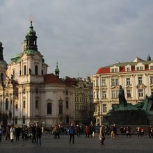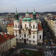 プラハの旧市街広場を取り囲む一角にある教会です。旧市街広場の周辺には、より大きなティーン教会があり、どうしてもそちらに目が行きがちですが、こちらの教会も丸い2本の尖塔が印象的です。