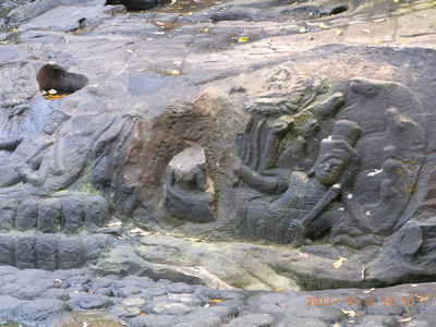 クバール・スピアンはシュリムアップの街から車で片道約2時間のところにある山の上にたたずむ水中遺跡だ。巨石がゴロゴロする山道を約40分上った先にあるのは、清らかな川の中に横たわるヴィシュヌ神、ラクシュミー妃、そしてリンガとヨニと呼ばれる生殖器を象る彫刻群だ。聖なる滝もある。こんな山の中にひっそりと神々しい彫刻が残っていることに感動した。他のアンコール遺跡のように建物ではなく、川の中に地味に繁栄の軌跡が残るクバールスピアン遺跡は趣も異なるのでお薦めだ。